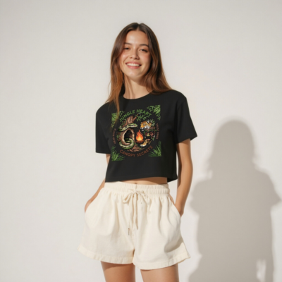 Discover the wild spirit with our ‘Jungle Heart’ women’s crop top—featuring a vibrant jungle scene with coiled snake, majestic jaguar, tribal mask, and campfire. Made for adventure lovers who ‘Hear Rustle, Trust Vines, Canopy Secrets.’ Eco-friendly fabric, stylish cropped fit, perfect for festivals or tropical getaways. Ideal for those seeking bold, nature-inspired fashion with meaningful symbolism.