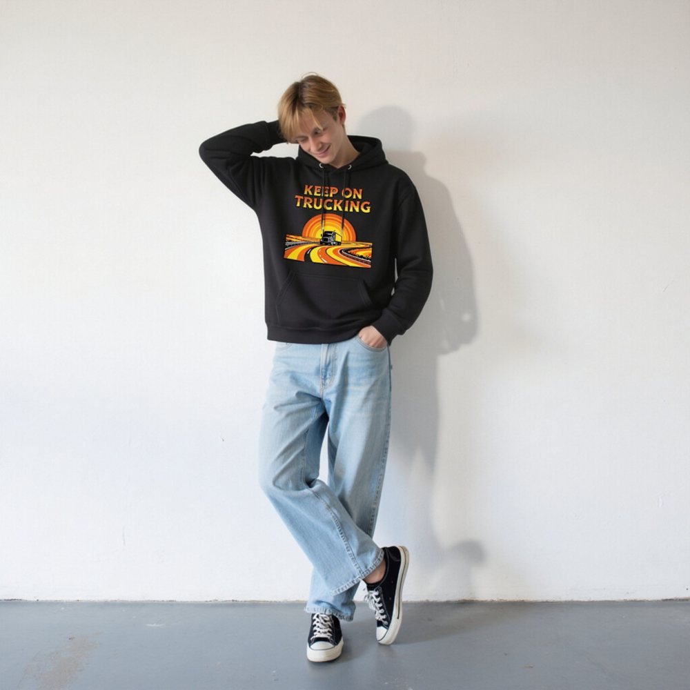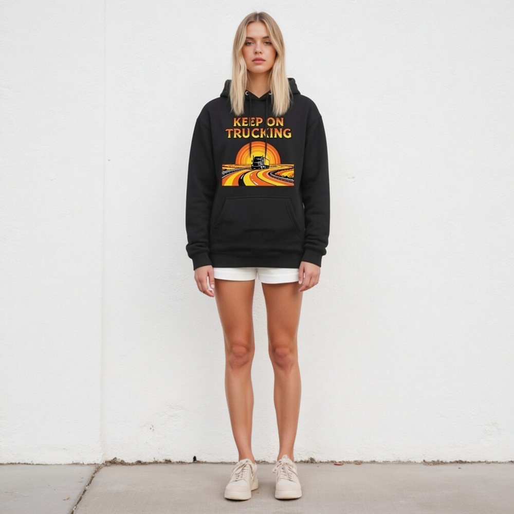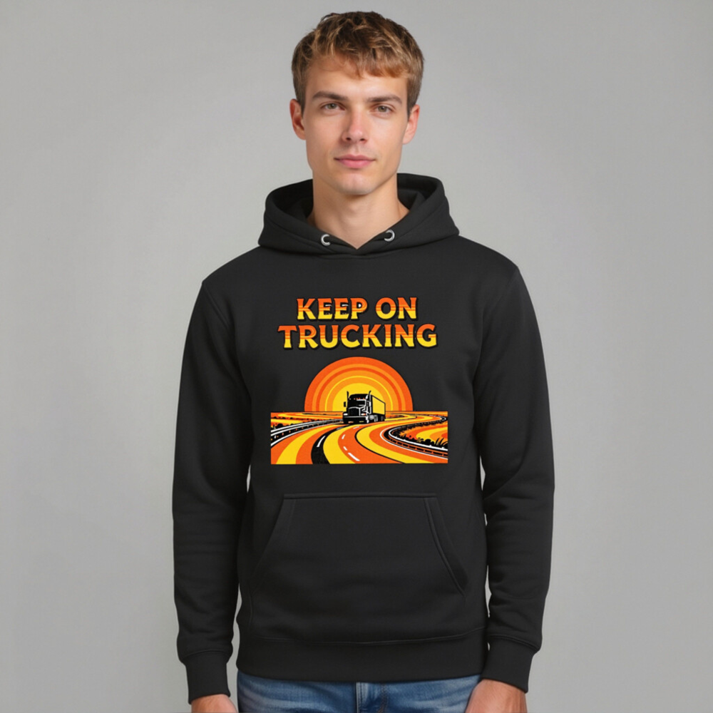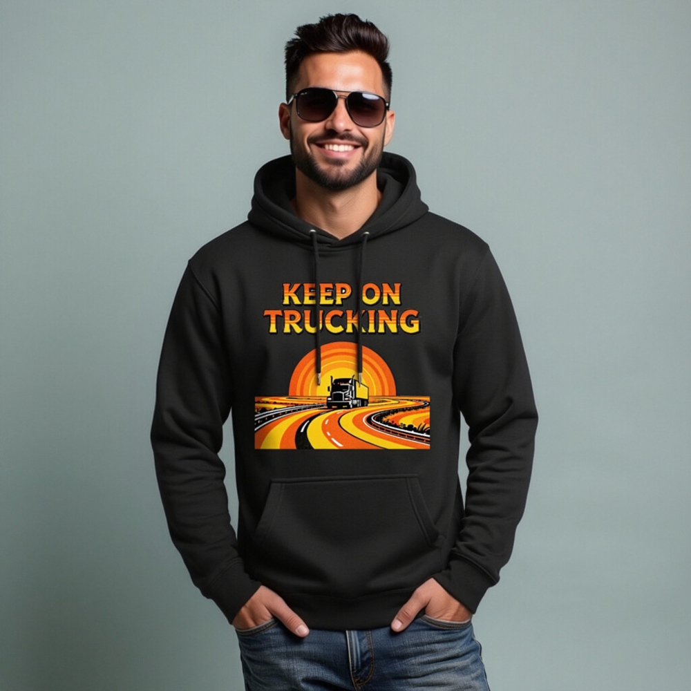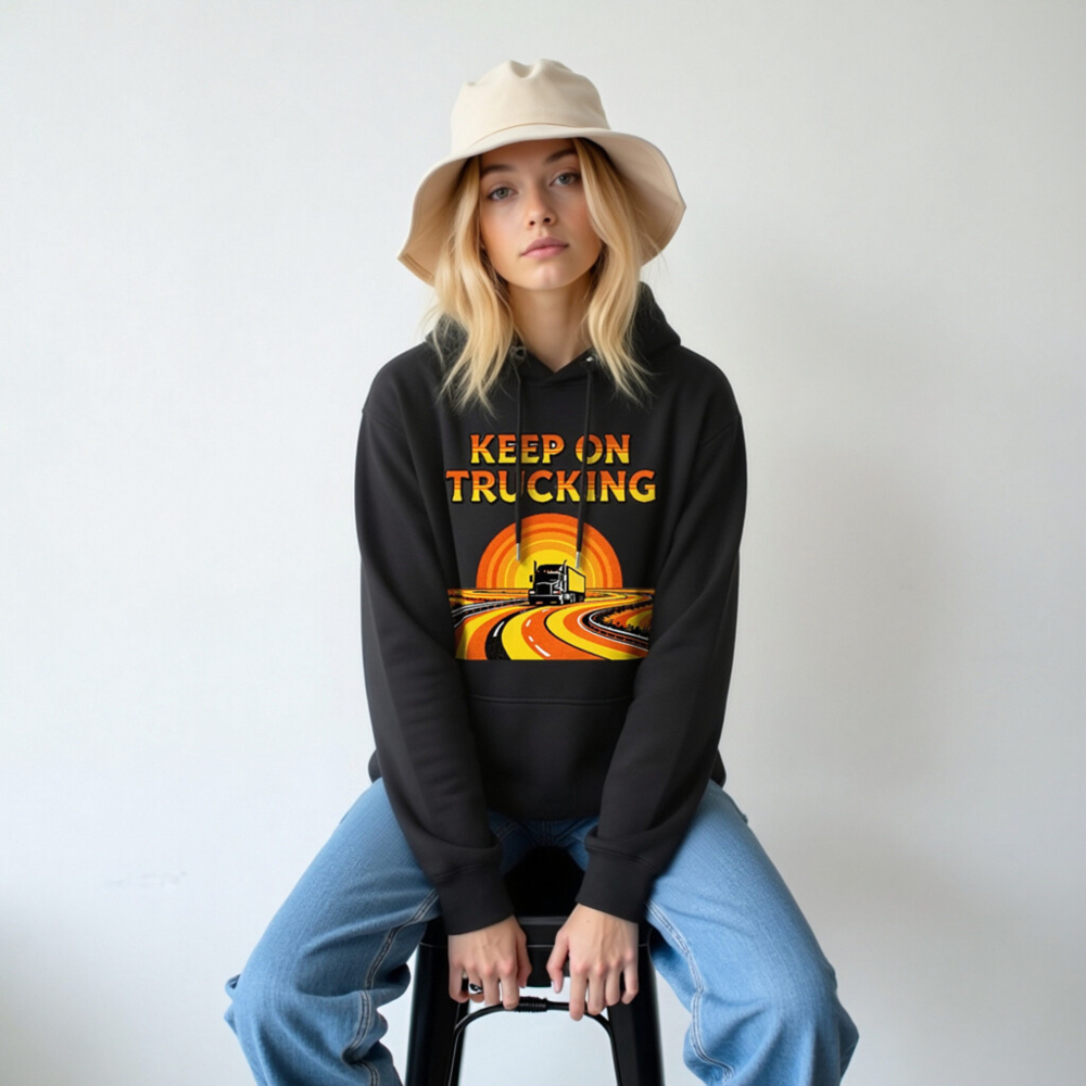 Wear the ‘Keep On Trucking’ spirit with this unisex premium pullover hoodie. Featuring a vibrant retro-style graphic of a semi-truck on a winding road under a sunset, it’s designed for comfort and style. Made from high-quality fabric for everyday wear. Perfect gift for truckers, drivers, or anyone who loves road trips and vintage aesthetics.