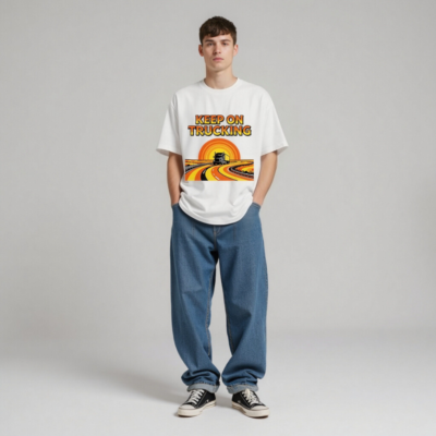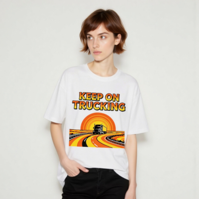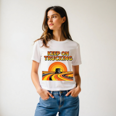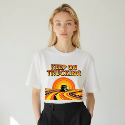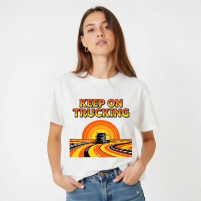 Wear the classic ‘Keep On Trucking’ slogan on this unisex organic cotton t-shirt, featuring a vibrant retro sunset road graphic with a semi-truck cruising down winding highways. Made from certified organic cotton for comfort and sustainability. Ideal for truckers, road trip lovers, and vintage style fans. Soft, breathable, and eco-friendly—perfect for daily wear or as a meaningful gift.