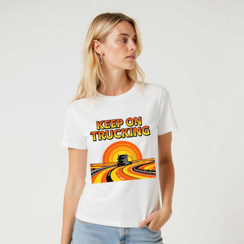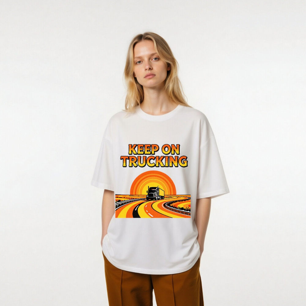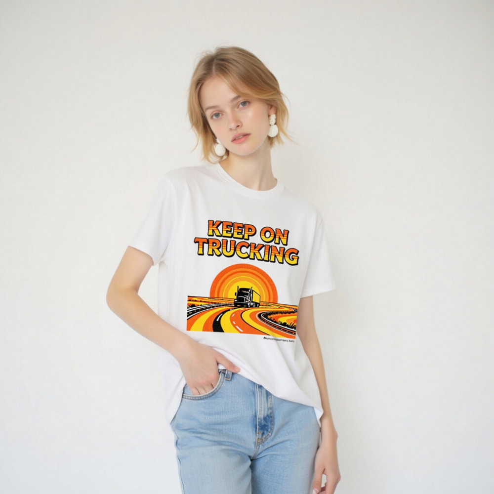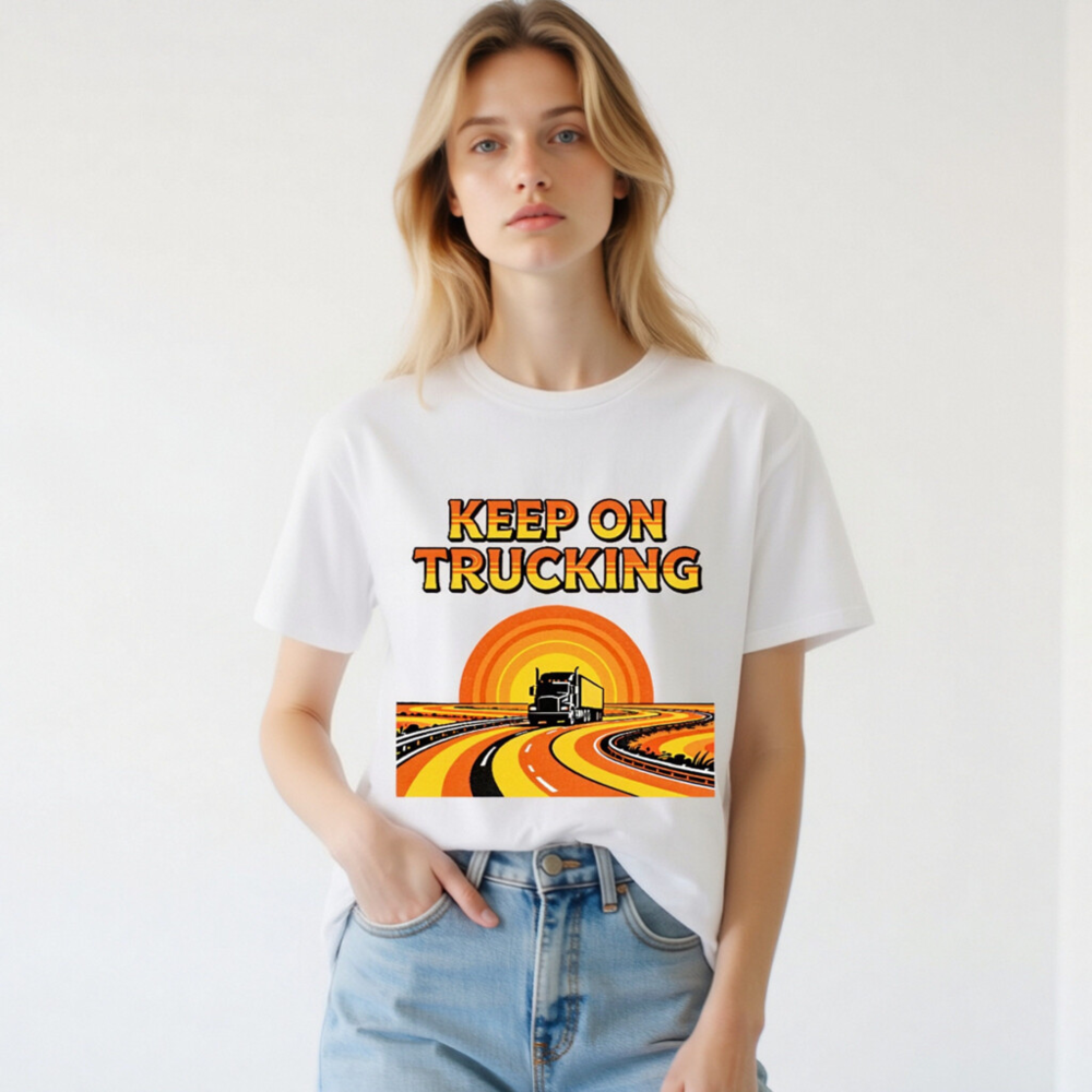 Wear the classic ‘Keep On Trucking’ slogan on this unisex organic cotton t-shirt, featuring a vibrant retro sunset road graphic with a semi-truck cruising down winding highways. Made from certified organic cotton for comfort and sustainability. Ideal for truckers, road trip lovers, and vintage style fans. Soft, breathable, and eco-friendly—perfect for daily wear or as a meaningful gift.