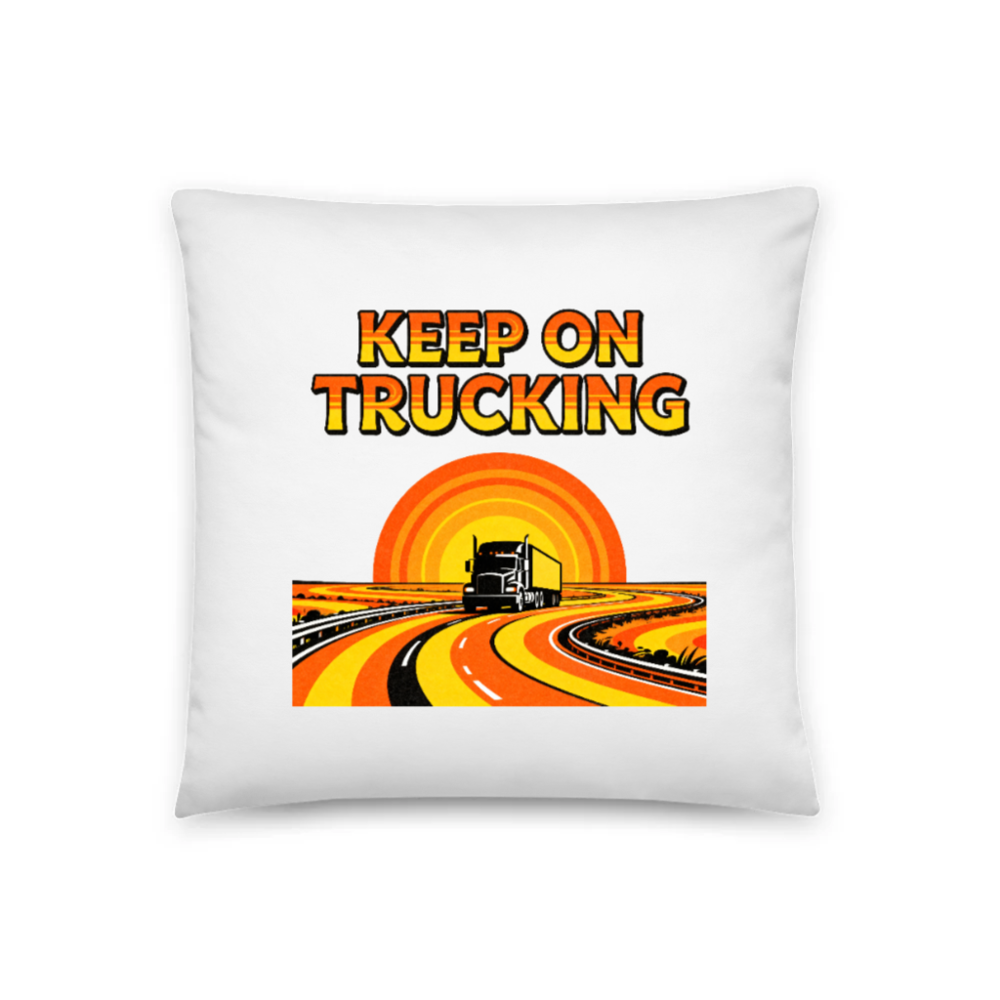 This 18″x18″ basic pillow features a vibrant ‘Keep On Trucking’ design with a retro-style truck on winding highways against a sunset. Perfect for truck enthusiasts, road trip lovers, or anyone who appreciates vintage-inspired automotive art. Soft, durable fabric—ideal as a cozy accent for beds, sofas, or offices. A fun, eye-catching gift for drivers and travelers.