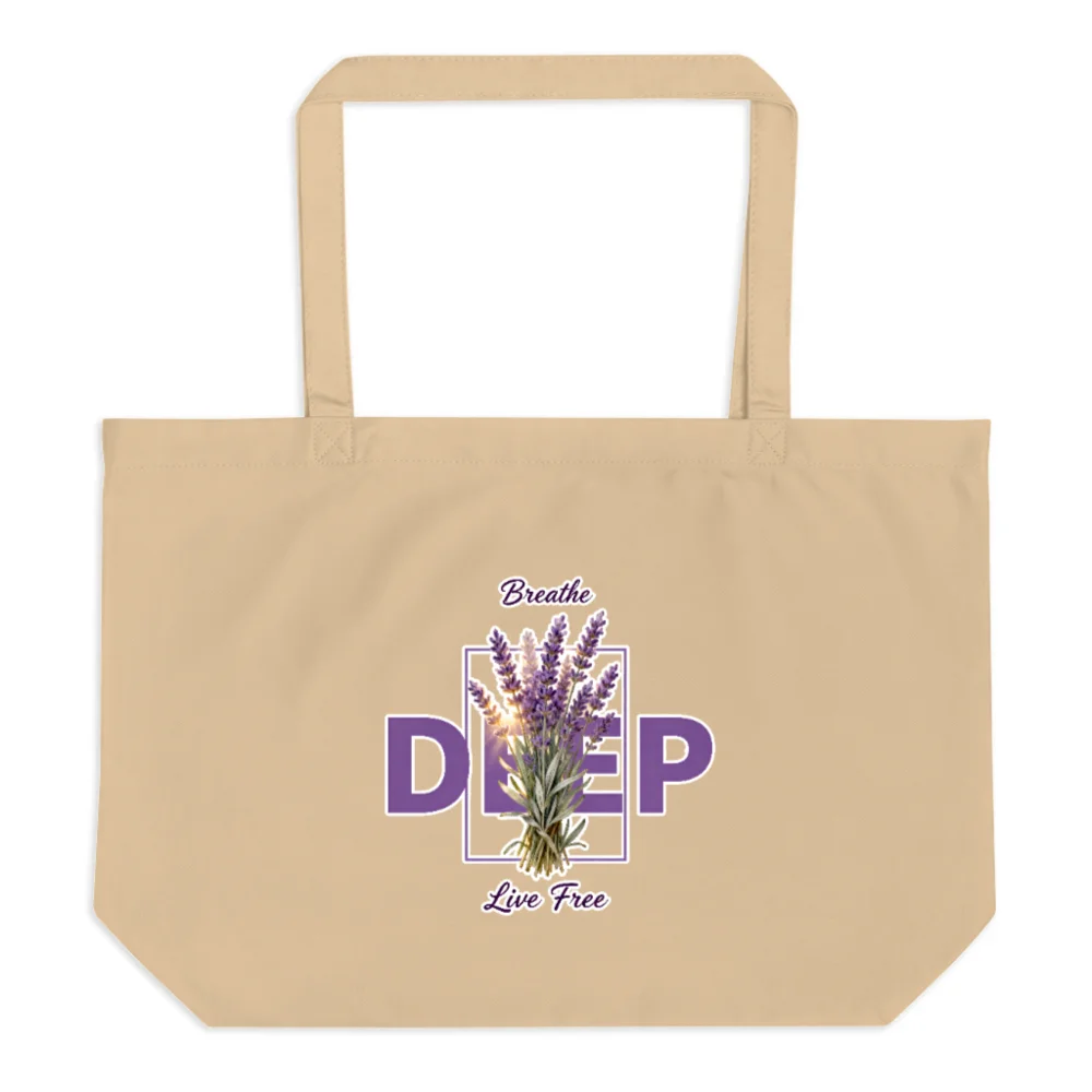 Eco-friendly large organic cotton tote bag featuring a calming ‘Breathe Deep, Live Free’ lavender design. Made from 100% GOTS-certified organic cotton, it’s durable, washable, and perfect for groceries, shopping, or daily use. The spacious interior and reinforced handles support heavy loads, while the soft natural fabric feels gentle on hands. Ideal for zero-waste living, yoga, farmers markets, or as a mindful gift. Lightweight yet sturdy—combines sustainability with serene aesthetics. No plastic, no compromise.