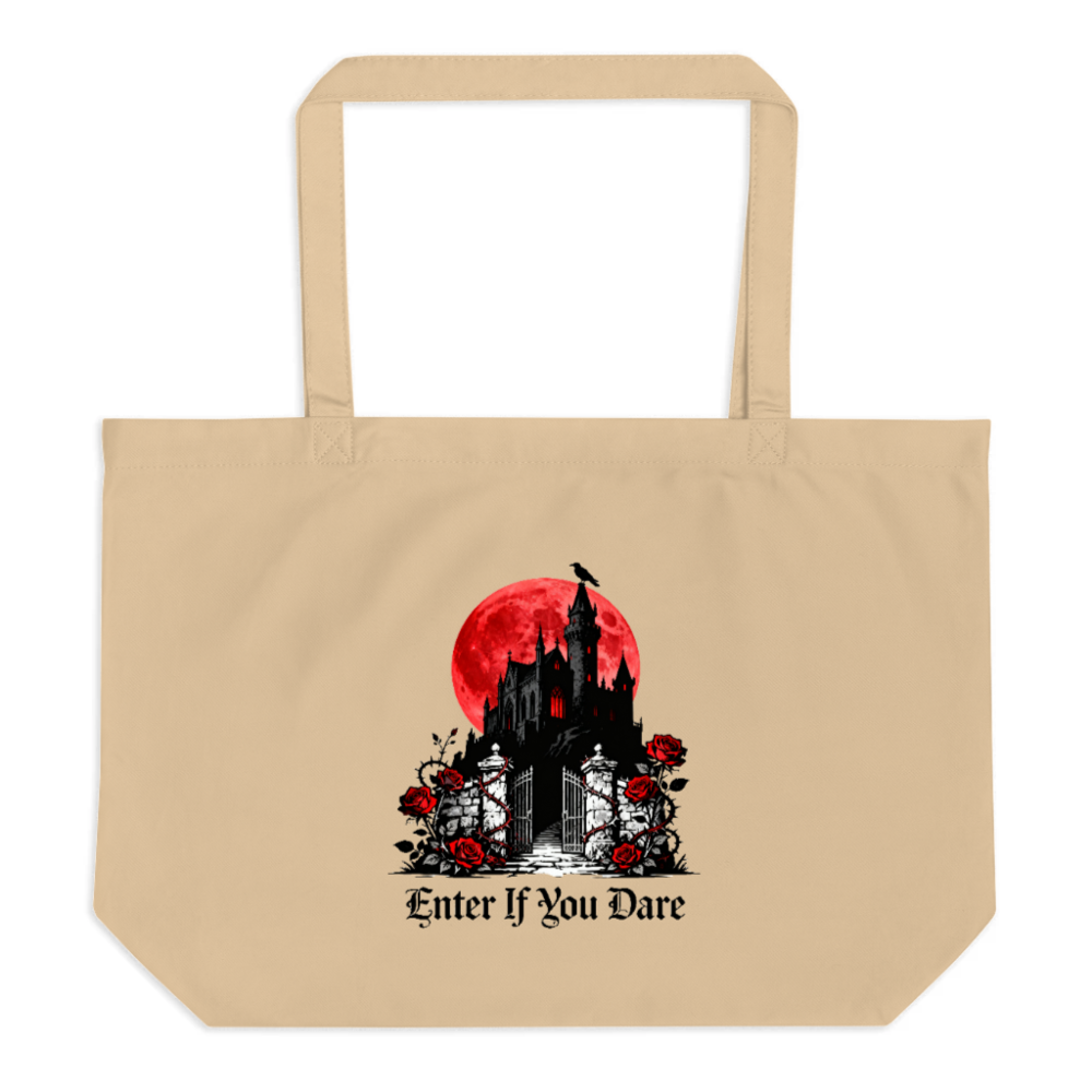 A large, eco-friendly organic cotton tote bag featuring a striking gothic castle silhouette against a vivid red moon, framed by thorny roses and an open gate with the bold phrase ‘Enter If You Dare’. Designed for sustainable everyday use, this stylish unisex bag combines dark fantasy art with responsible materials. Made from certified organic cotton—no synthetic additives or harmful dyes. Perfect for shoppers who value both ethical sourcing and hauntingly beautiful aesthetics.