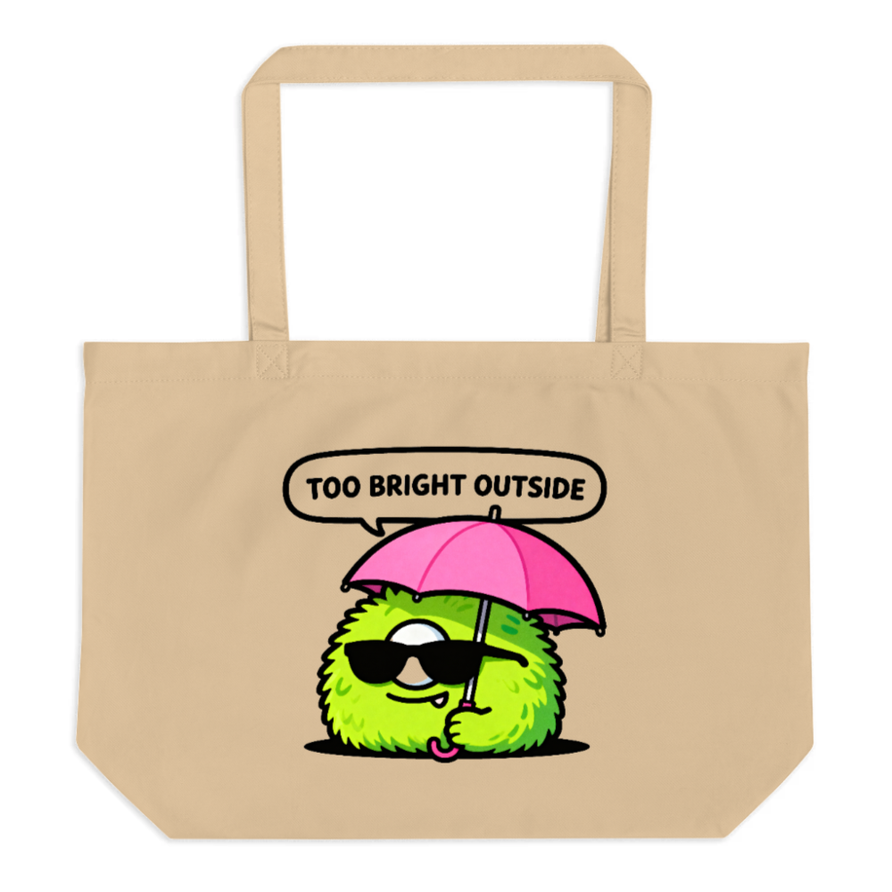 Eco-friendly large organic tote bag featuring a playful green monster holding a pink umbrella and sunglasses, saying ‘Too Bright Outside’. Made from certified organic cotton (verified by GOTS), this stylish, sustainable bag combines fun design with responsible sourcing. Ideal for shopping, travel, or everyday use — durable, reusable, and planet-friendly.