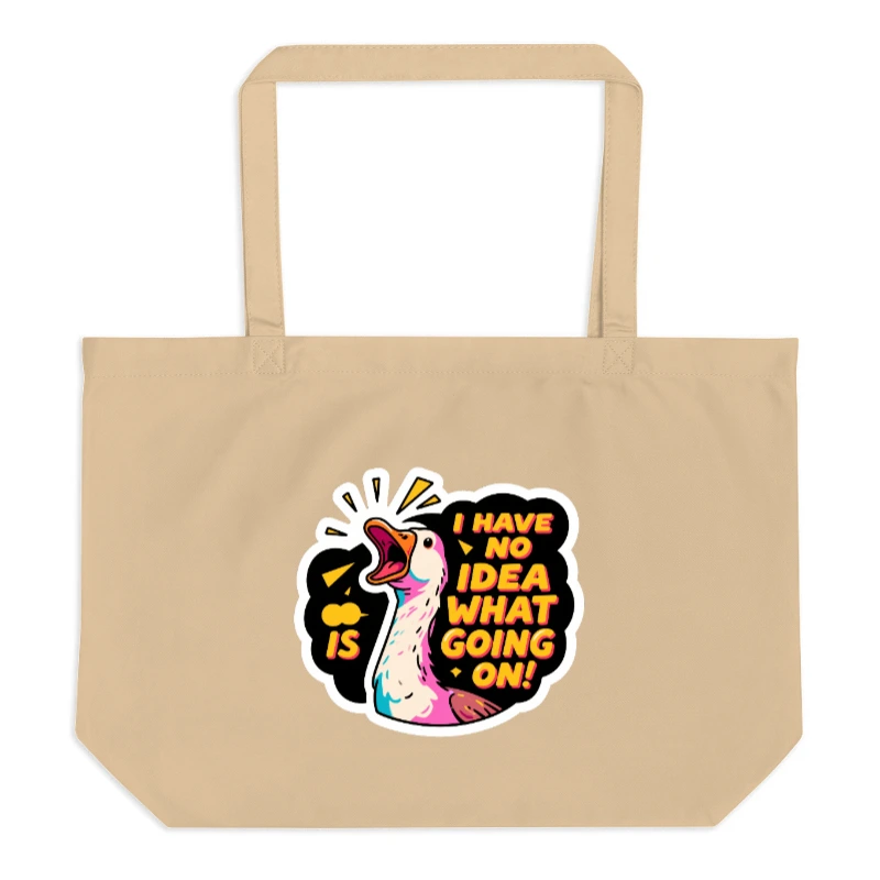 A spacious, eco-friendly large organic tote bag featuring a vibrant cartoon duck shouting ‘I HAVE NO IDEA WHAT GOING ON!’—perfect for everyday use with a playful, relatable vibe. Made from certified organic cotton (verified by GOTS standard), this durable, sustainable bag supports ethical fashion. Ideal for shoppers, students, and anyone who appreciates humor and environmental responsibility. Lightweight, machine-washable, and designed to last.