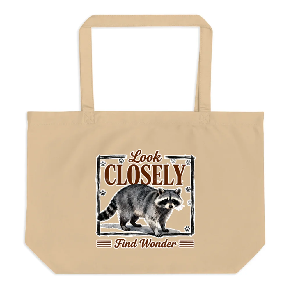 Large Organic Tote Bag | Look Closely Find Wonder Raccoon Design