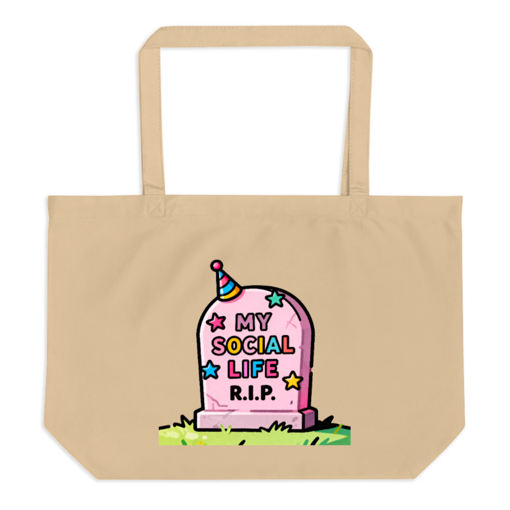 Eco-friendly large organic tote bag featuring a playful pink tombstone with ‘My Social Life R.I.P.’ text, colorful stars, and a party hat—perfect for sustainable shoppers who love dark humor. Made from certified organic cotton (GOTS-certified), this durable, reusable bag supports eco-conscious living without compromising on style or comfort.