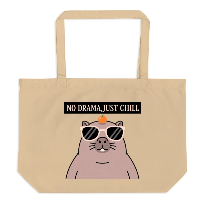 Eco-friendly large organic tote bag featuring a chill guinea pig with sunglasses and an orange on its head, paired with the laid-back slogan ‘NO DRAMA, JUST CHILL’. Made from sustainable materials for everyday use. Perfect for shopping, travel, or as a statement accessory—simple, stylish, and planet-conscious.