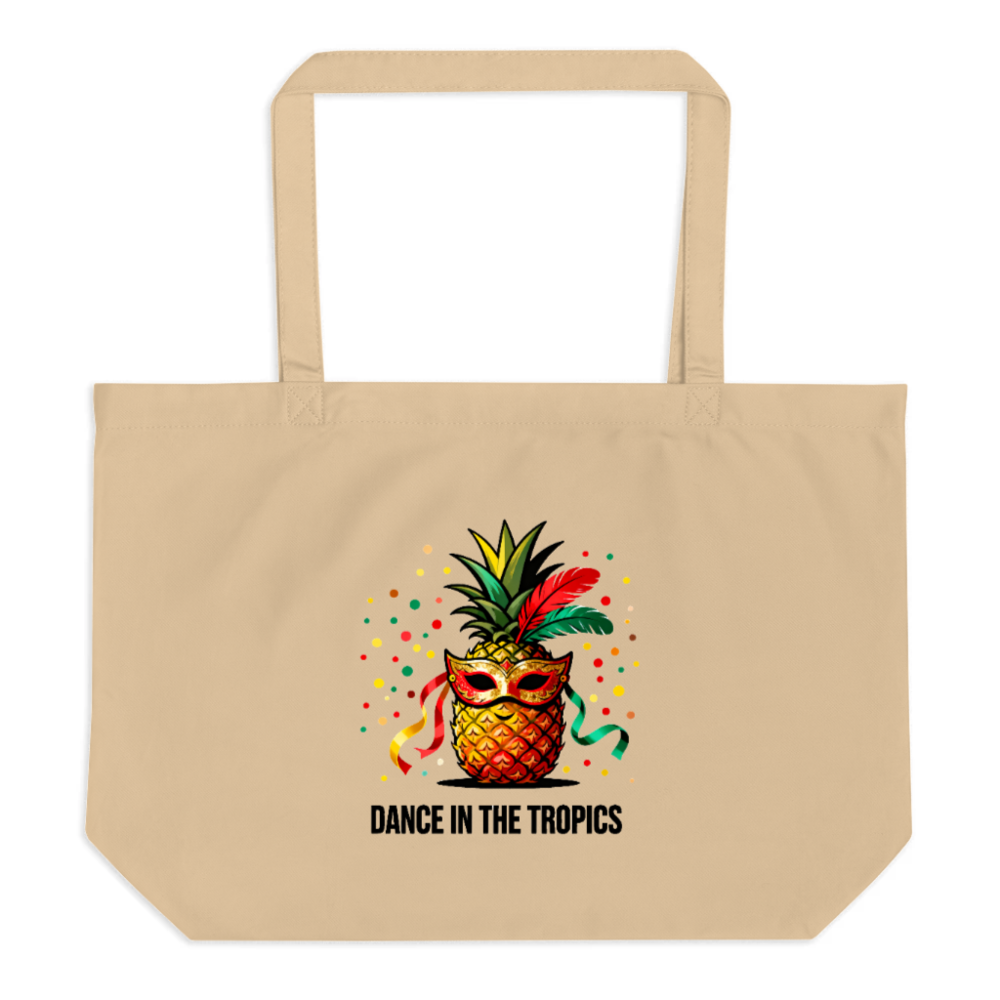 This large organic tote bag features a vibrant pineapple wearing a festive Mardi Gras mask with red, green, and gold feathers—perfect for tropical vibes. Made from certified organic cotton, it’s eco-friendly, durable, and reusable. The bold ‘Dance in the Tropics’ print adds playful charm. Ideal for shopping, travel, or everyday use—reduce waste without sacrificing style.