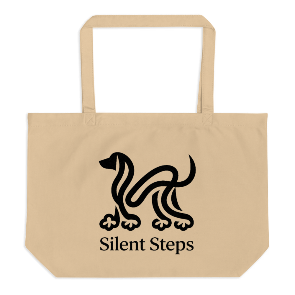 This large, eco-conscious tote bag features a minimalist black dog silhouette and ‘Silent Steps’ text on natural-colored organic cotton canvas. Designed for everyday use with sturdy handles and spacious interior, it’s perfect for shopping, work, or travel. Made from certified organic materials — no synthetic additives, dyes, or plastic components. Lightweight, durable, and sustainably crafted to reduce environmental impact while supporting mindful consumption.