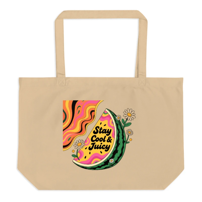 Eco-friendly large organic tote bag featuring a vibrant watermelon slice with ‘Stay Cool & Juicy’ text, surrounded by daisies and psychedelic swirls. Made from certified organic cotton—soft, durable, and sustainable for everyday use. Ideal for shopping, travel, or as a stylish zero-waste accessory. Lightweight, spacious, and proudly eco-conscious.