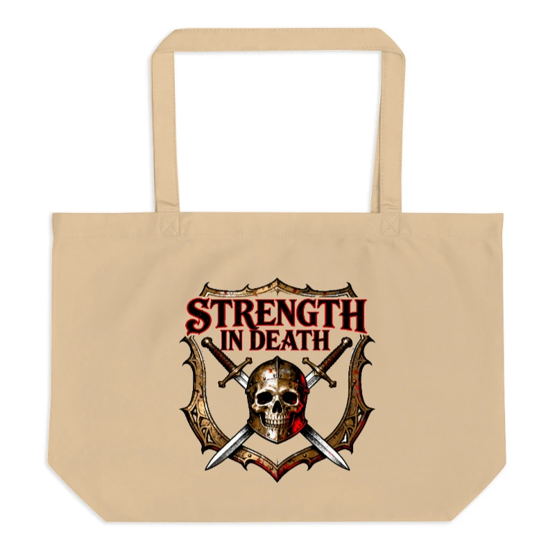 Eco-friendly large organic tote bag featuring a bold ‘Strength in Death’ design with skull, crossed swords, and shield motif. Made from certified organic cotton for durability and sustainability. Ideal for everyday use, shopping, or as a statement accessory. Lightweight, spacious, and machine-washable. Supports ethical, planet-conscious living.