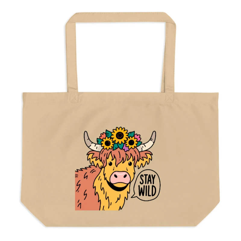 This large organic tote bag features a charming highland cow adorned with sunflowers and colorful blooms, paired with the inspiring ‘STAY WILD’ speech bubble. Made from certified organic cotton (verified by GOTS standard), it offers eco-friendly durability and stylish everyday utility. The bold, playful design makes it a standout accessory for nature lovers and sustainable fashion advocates.