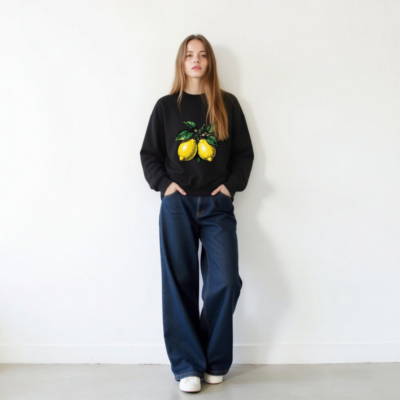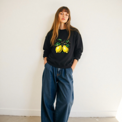 A stylish unisex crew neck sweatshirt featuring a vibrant vintage-style lemon branch print with two bright yellow lemons, green leaves, and delicate blossoms. Crafted for comfort with soft, durable fabric—ideal for casual wear year-round. Perfect for citrus lovers and nature-inspired fashion. Size inclusive, machine washable, true to size.