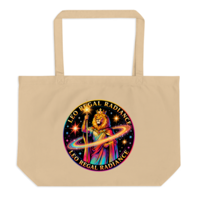 Elevate your everyday with this large organic tote bag featuring the vibrant ‘Leo Regal Radiance’ design—a crowned lion holding a radiant staff against a cosmic backdrop with colorful rings and stars. Crafted from certified organic cotton for durability and sustainability, it’s perfect for shopping, travel, or as a statement accessory. Lightweight, spacious, and ethically made—carry purpose and pride.