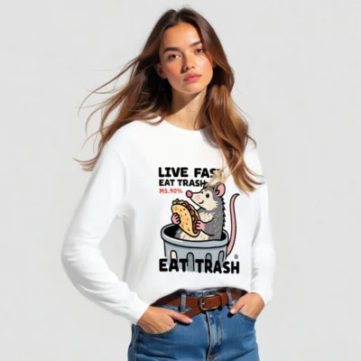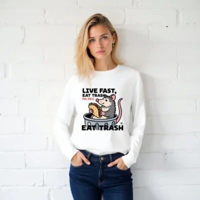 This unisex long sleeve tee features a playful cartoon opossum in a trash can holding a taco, with the bold text ‘LIVE FAST, EAT TRASH’ and ‘MS.90%’. Designed for casual wear, this white graphic tee combines humor and pop culture flair. The design is printed on premium cotton blend fabric for comfort and durability. Perfect for fans of quirky animal art and meme-inspired fashion.
