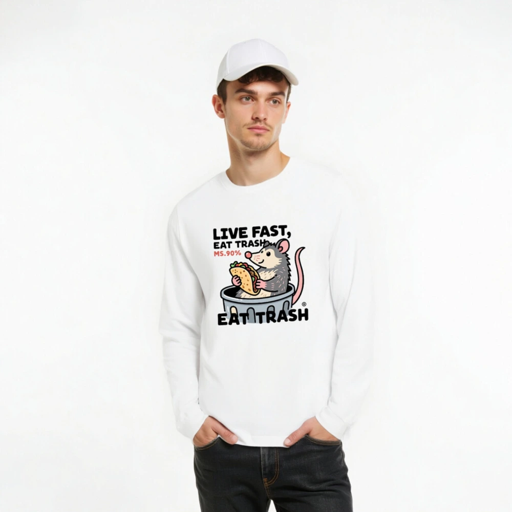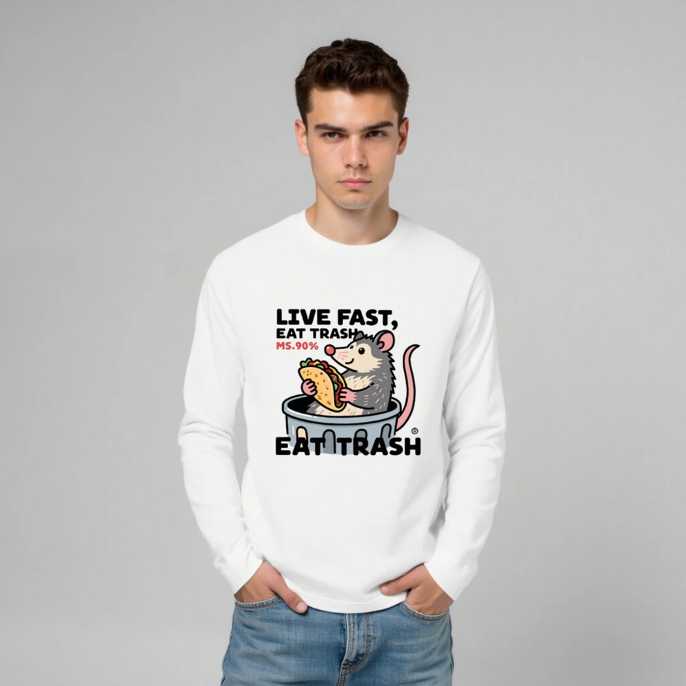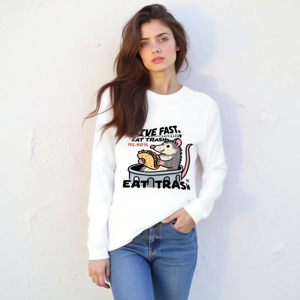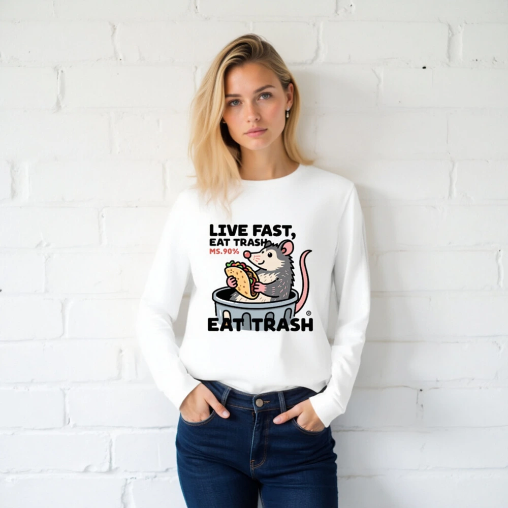 This unisex long sleeve tee features a playful cartoon opossum in a trash can holding a taco, with the bold text ‘LIVE FAST, EAT TRASH’ and ‘MS.90%’. Designed for casual wear, this white graphic tee combines humor and pop culture flair. The design is printed on premium cotton blend fabric for comfort and durability. Perfect for fans of quirky animal art and meme-inspired fashion.