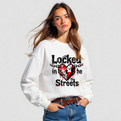 Unisex long sleeve tee featuring a bold graphic: a red-and-white heart with a keyhole, chained across the top, and dripping ink effect. The design reads ‘Locked in the Streets’ in distressed black font with red accents. High-quality cotton blend, comfortable fit for everyday wear. Ideal for streetwear lovers seeking edgy, urban-inspired fashion.