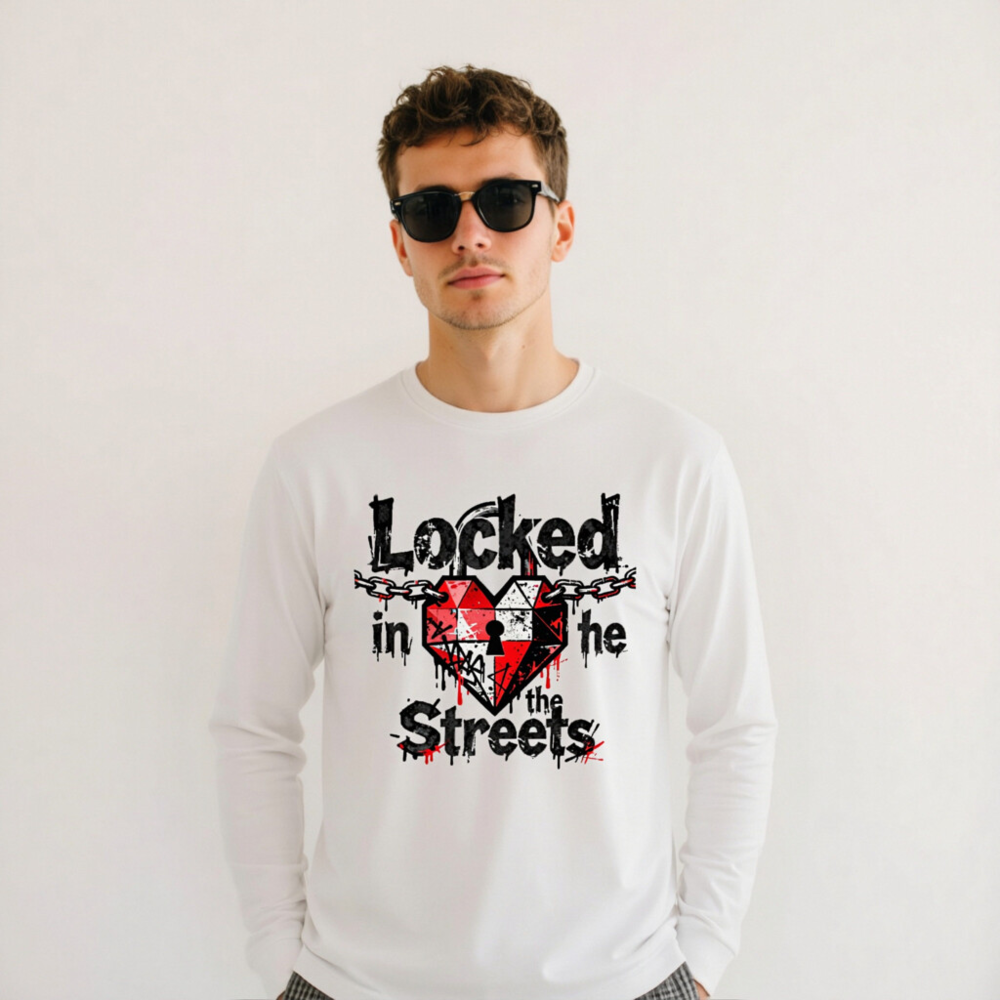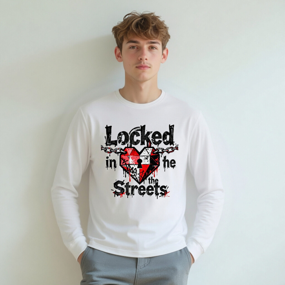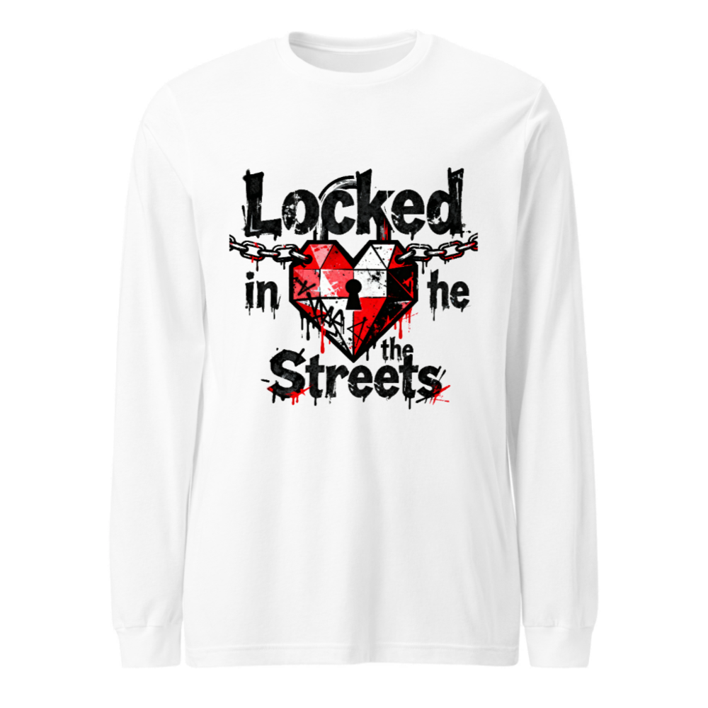 Unisex long sleeve tee featuring a bold graphic: a red-and-white heart with a keyhole, chained across the top, and dripping ink effect. The design reads ‘Locked in the Streets’ in distressed black font with red accents. High-quality cotton blend, comfortable fit for everyday wear. Ideal for streetwear lovers seeking edgy, urban-inspired fashion.