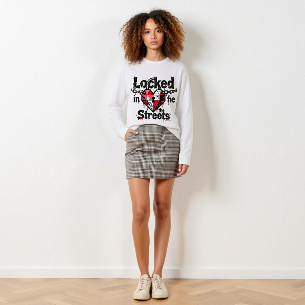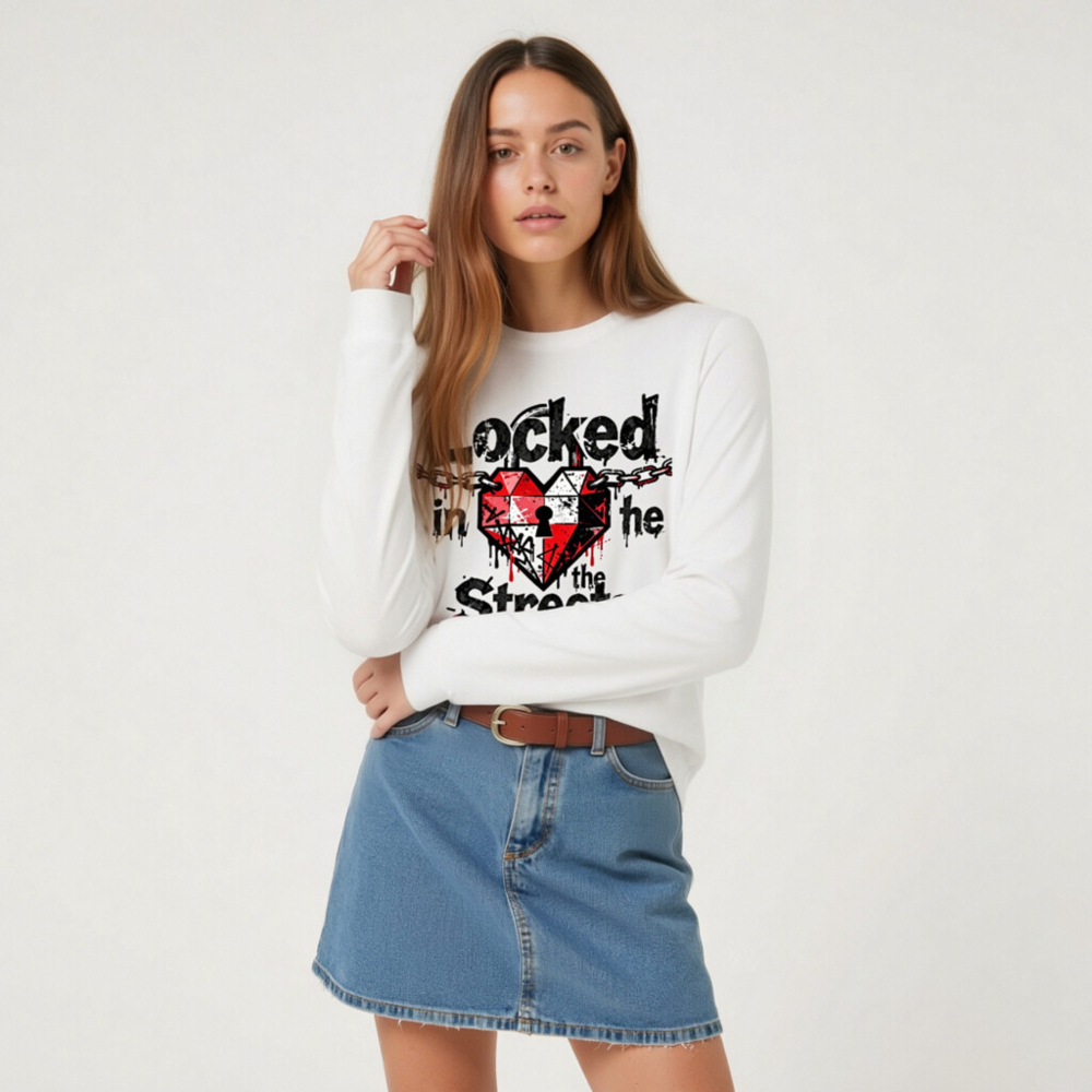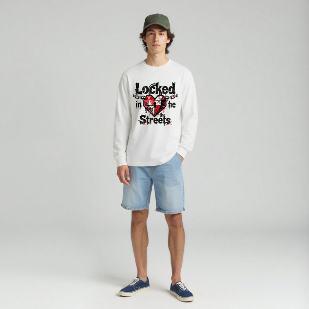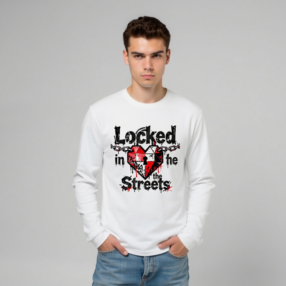 Unisex long sleeve tee featuring a bold graphic: a red-and-white heart with a keyhole, chained across the top, and dripping ink effect. The design reads ‘Locked in the Streets’ in distressed black font with red accents. High-quality cotton blend, comfortable fit for everyday wear. Ideal for streetwear lovers seeking edgy, urban-inspired fashion.