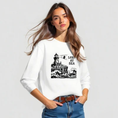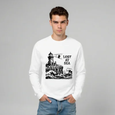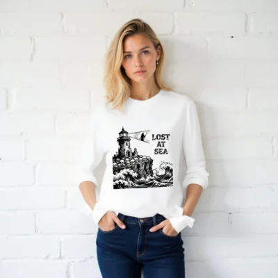 This unisex long sleeve tee features a striking black-and-white vintage nautical illustration: a crumbling lighthouse perched atop a cliff lined with skulls, towering over crashing ocean waves, with the grim phrase ‘LOST AT SEA’ beside a hooded figure holding a beam of light. Designed for bold, gothic maritime lovers, this high-quality cotton blend offers comfortable everyday wear. Perfect for Halloween, sea-themed events, or as a statement piece for those who embrace dark romance and coastal mystery.