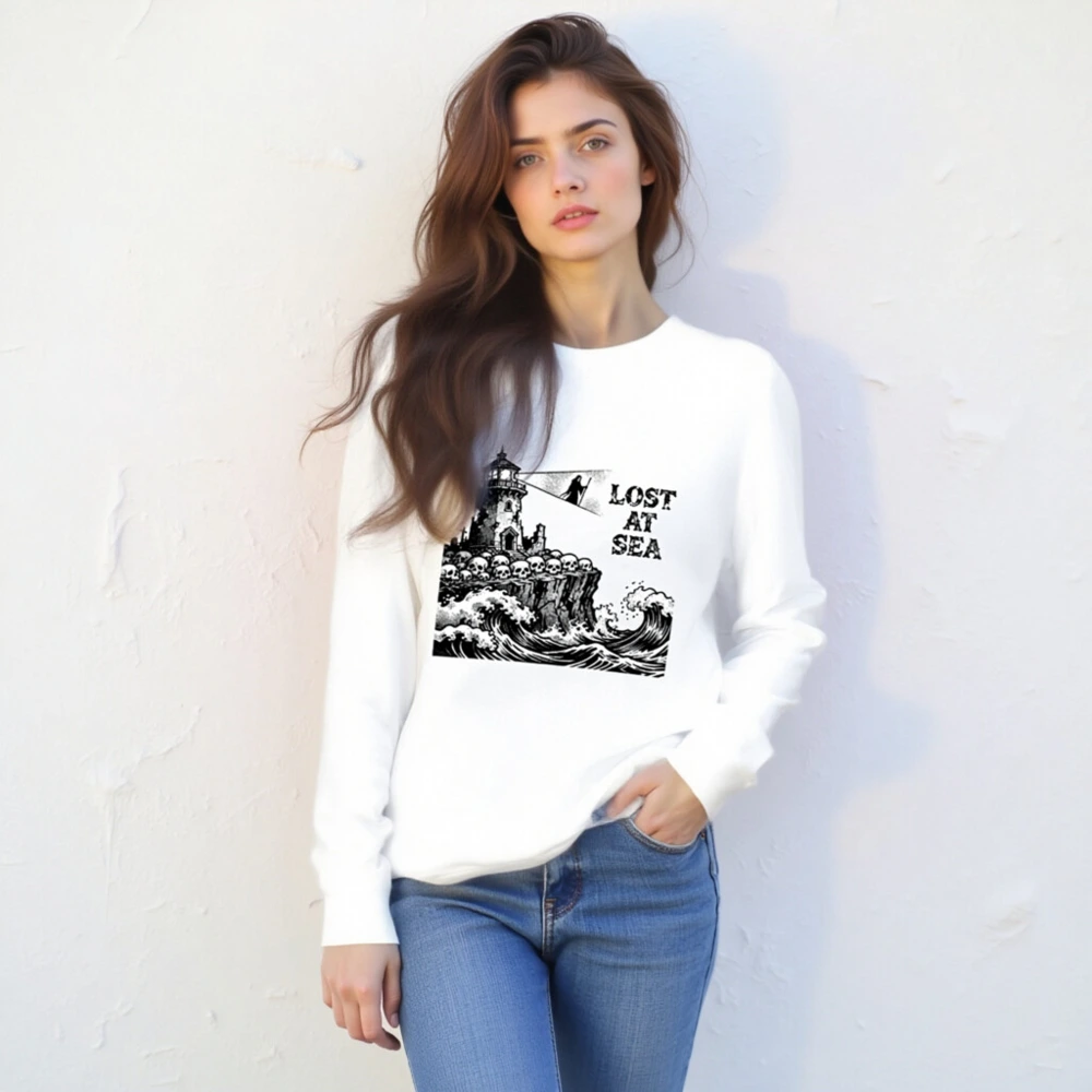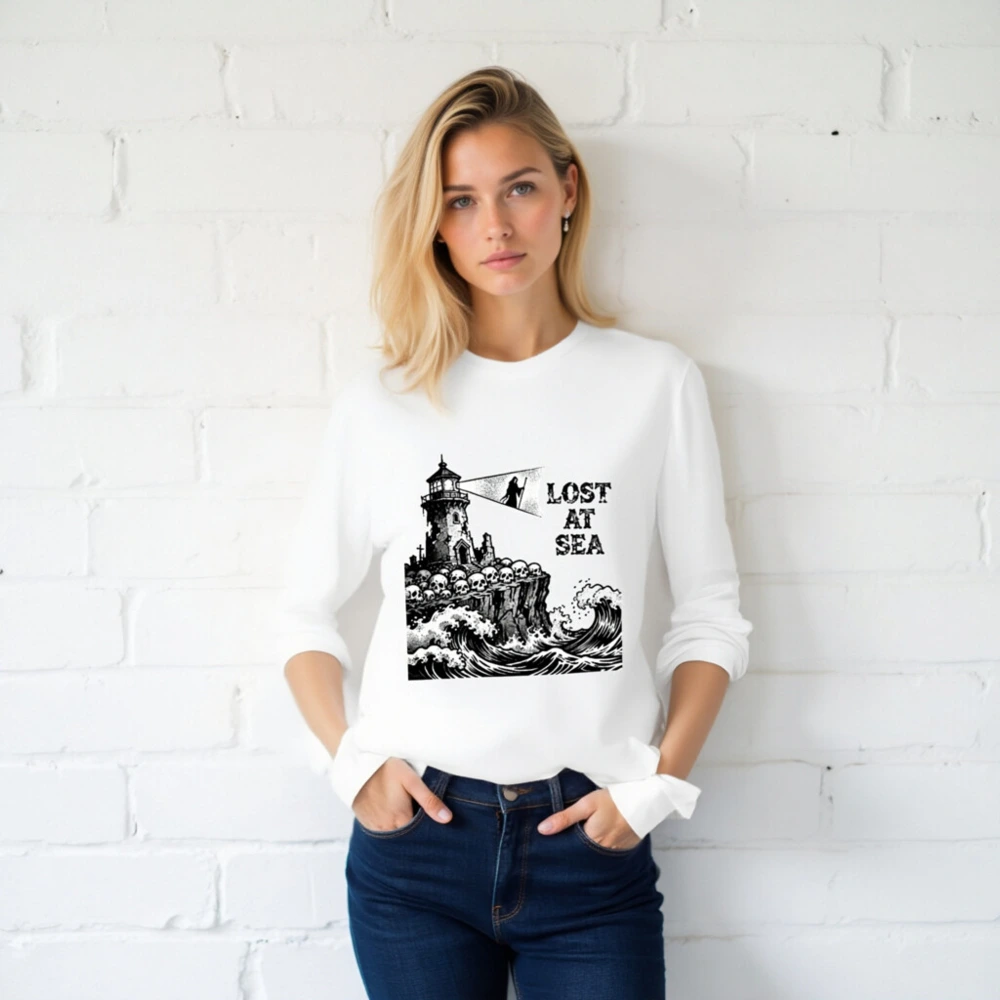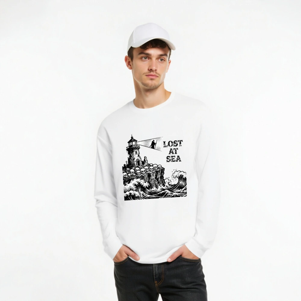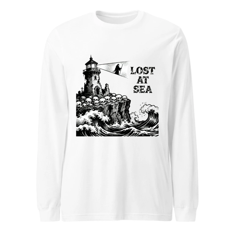 This unisex long sleeve tee features a striking black-and-white vintage nautical illustration: a crumbling lighthouse perched atop a cliff lined with skulls, towering over crashing ocean waves, with the grim phrase ‘LOST AT SEA’ beside a hooded figure holding a beam of light. Designed for bold, gothic maritime lovers, this high-quality cotton blend offers comfortable everyday wear. Perfect for Halloween, sea-themed events, or as a statement piece for those who embrace dark romance and coastal mystery.