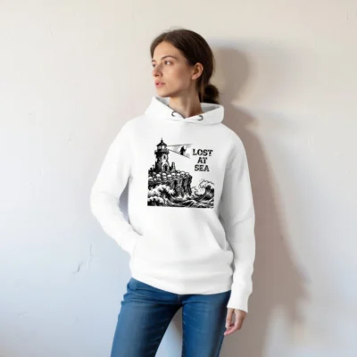 Wear the haunting ‘Lost at Sea’ design: a weathered lighthouse perched on a cliff of skulls, towering above crashing waves. This unisex premium pullover hoodie features soft, comfortable fabric and a bold black-and-white graphic. Ideal for maritime lovers and gothic style enthusiasts. Durable construction, versatile fit—perfect for everyday wear or as a statement piece.