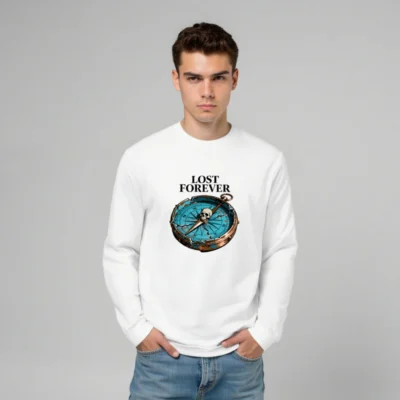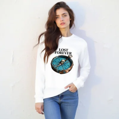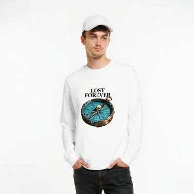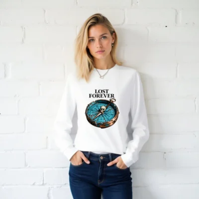 Wear the ‘Lost Forever’ vintage-style unisex long sleeve tee featuring a cracked compass with skull motif on a blue background. Designed for casual, adventurous wear—soft cotton blend, relaxed fit, durable print. Perfect for fans of gothic, nautical, or retro aesthetics. Ideal for everyday comfort and statement style.
