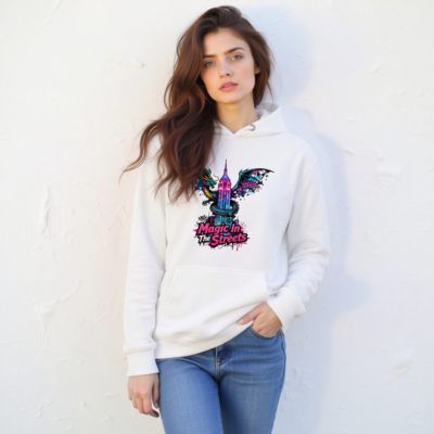 Unisex premium pullover hoodie featuring vibrant dragon wrapping the Empire State Building, bold ‘Magic In The Streets’ graffiti-style text. Designed for comfort with soft fleece, classic drawstring hood, and front pouch pocket. Ideal for urban fantasy fans—wear magic on your streets. Made to fit all genders, perfect for casual wear or collector’s appeal.