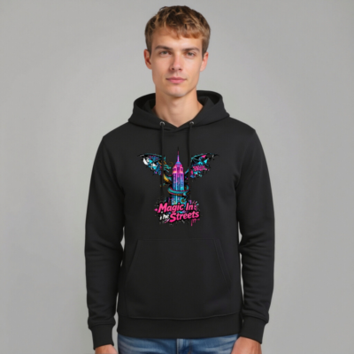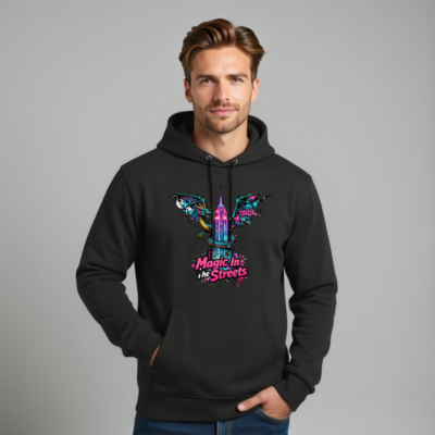 Wear urban magic with this unisex essential eco hoodie, featuring a vibrant neon dragon coiling around the Empire State Building—symbolizing city energy and fantasy. Made from sustainable materials, it’s soft, comfortable, and designed for everyday wear. The bold ‘Magic In the Streets’ graphic makes a statement. Perfect for fans of street art, fantasy, and eco-conscious fashion. Lightweight, versatile, and proudly unisex.