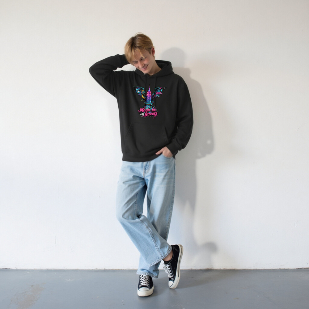 Wear urban magic with this unisex essential eco hoodie, featuring a vibrant neon dragon coiling around the Empire State Building—symbolizing city energy and fantasy. Made from sustainable materials, it’s soft, comfortable, and designed for everyday wear. The bold ‘Magic In the Streets’ graphic makes a statement. Perfect for fans of street art, fantasy, and eco-conscious fashion. Lightweight, versatile, and proudly unisex.
