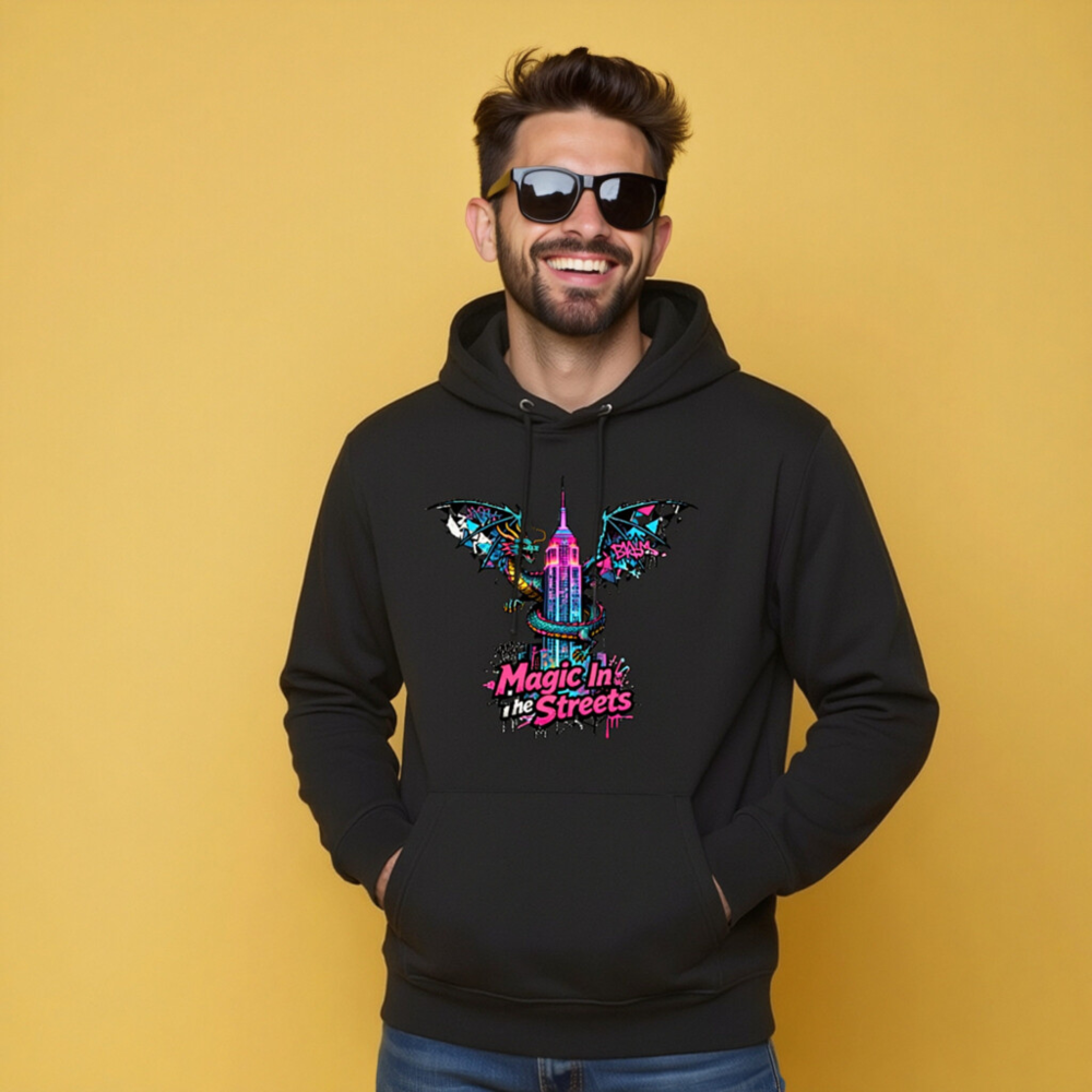 Magic In the Streets Unisex Eco Hoodie – Neon Dragon & Empire State Building Design