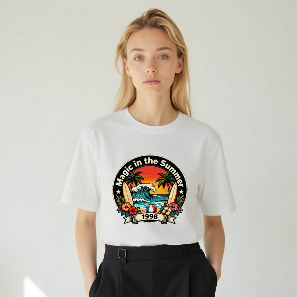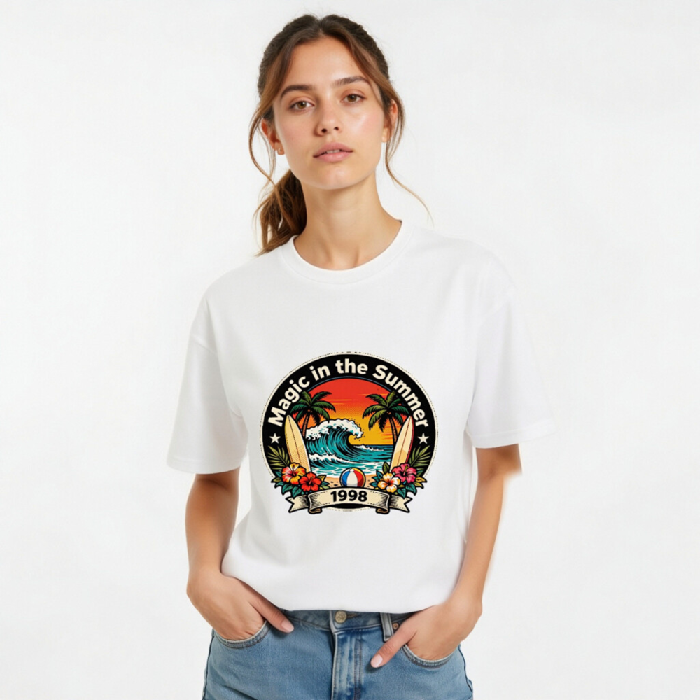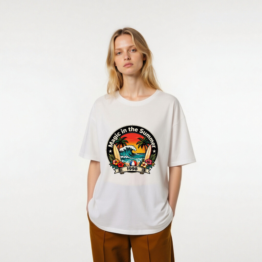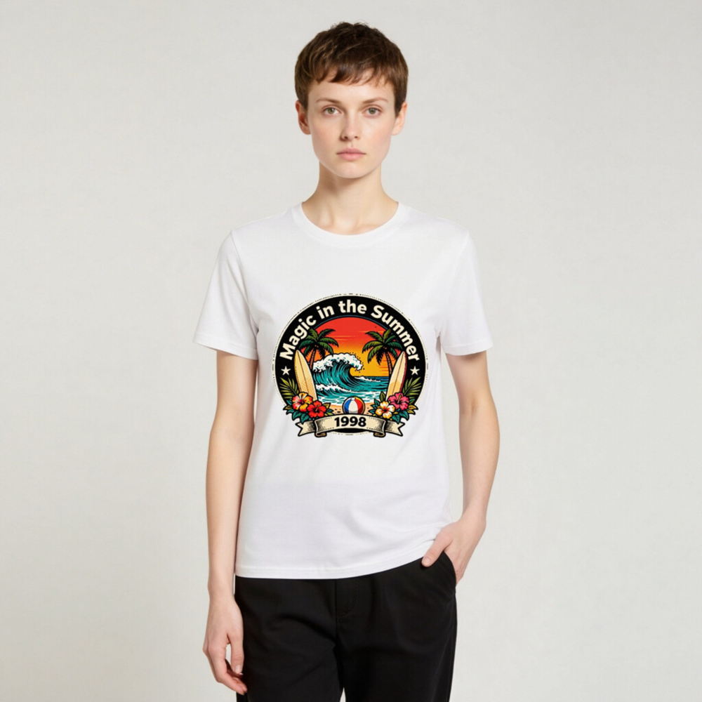 Celebrate summer vibes with this unisex organic cotton t-shirt featuring a vibrant retro beach design: palm trees, crashing waves, surfboards, hibiscus flowers, and a beach ball. The ‘Magic in the Summer 1998’ circular emblem evokes nostalgic 90s coastal charm. Soft, eco-friendly, and comfortable for all-day wear. Perfect gift for beach lovers or vintage fashion fans.