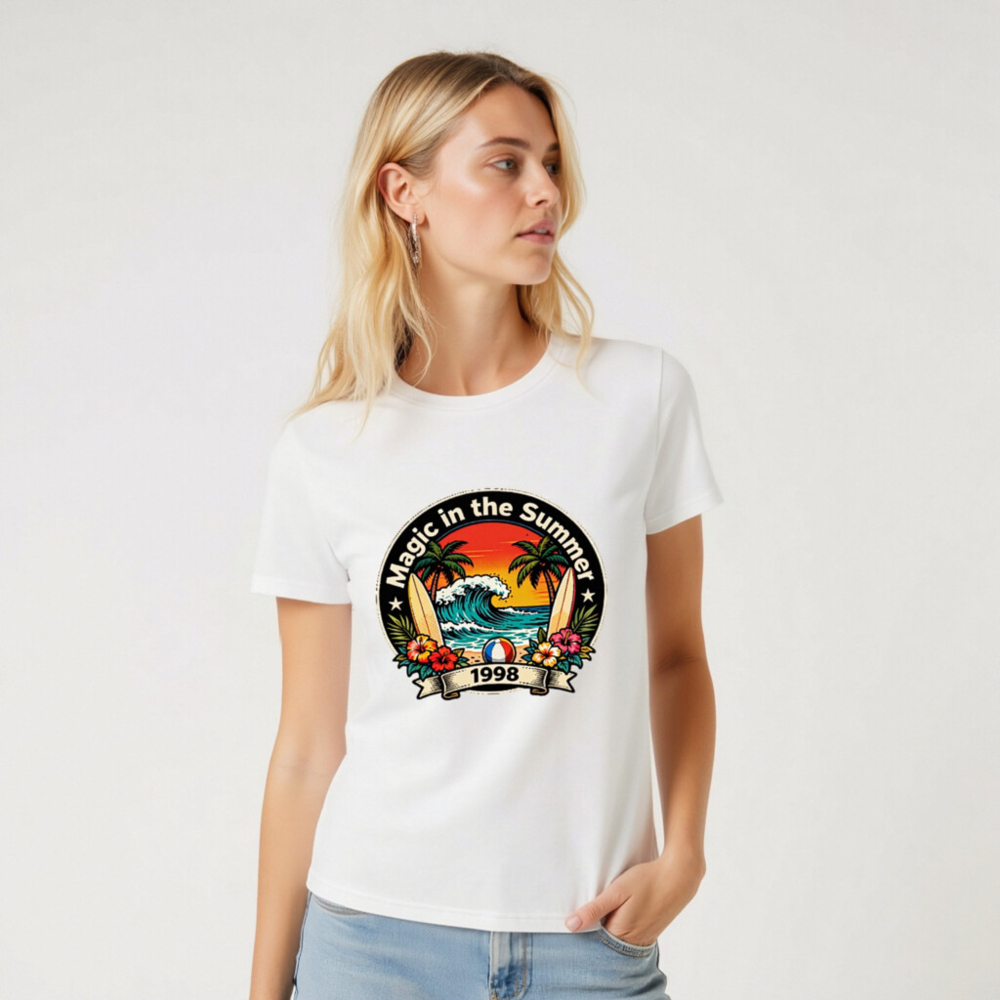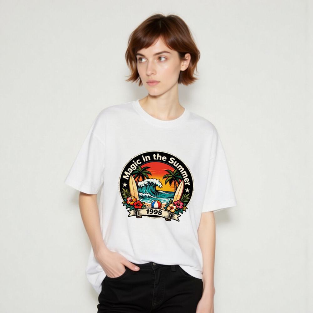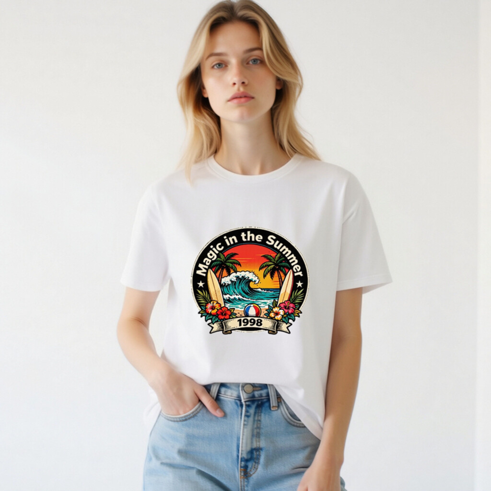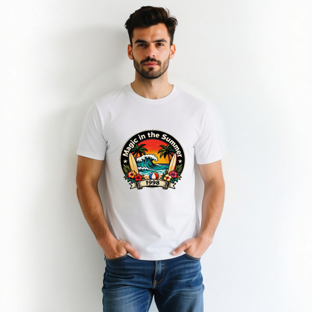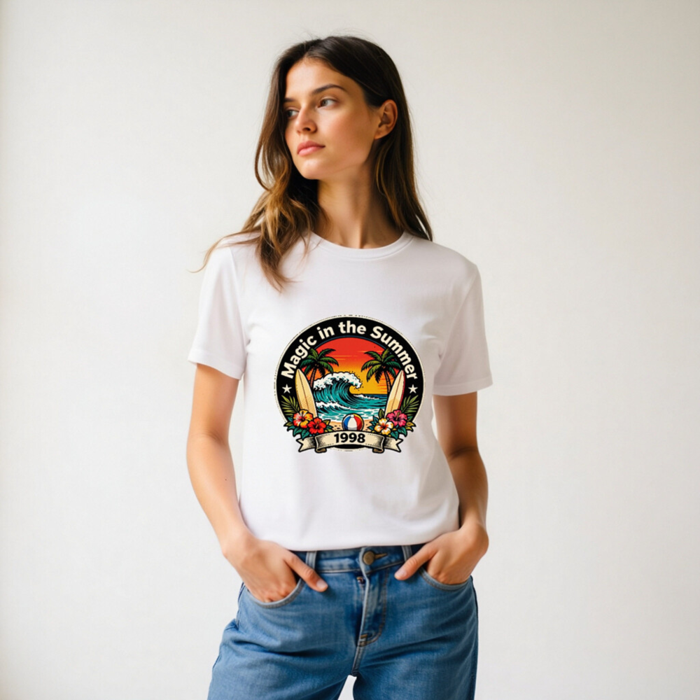 Celebrate summer vibes with this unisex organic cotton t-shirt featuring a vibrant retro beach design: palm trees, crashing waves, surfboards, hibiscus flowers, and a beach ball. The ‘Magic in the Summer 1998’ circular emblem evokes nostalgic 90s coastal charm. Soft, eco-friendly, and comfortable for all-day wear. Perfect gift for beach lovers or vintage fashion fans.