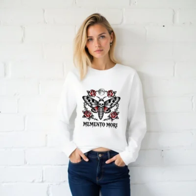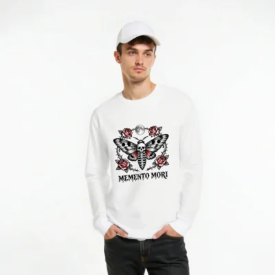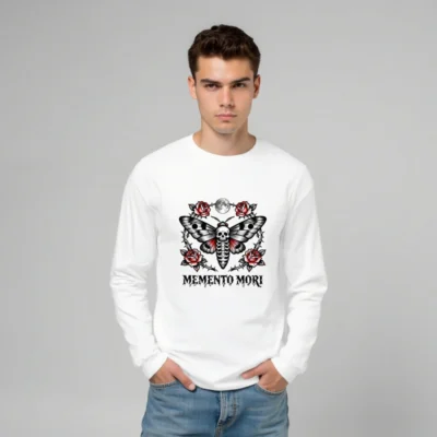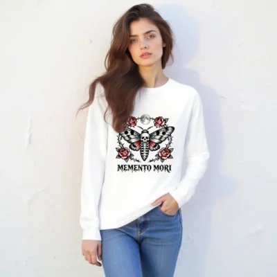 This unisex long sleeve tee features a striking black-and-white moth with a skull body, red-wing accents, and vintage-style roses surrounding a full moon. The ‘MEMENTO MORI’ text below reinforces the gothic, reflective theme. Ideal for fans of tattoo art, dark aesthetics, and symbolic fashion. Comfortable fit, classic crew neck, premium print quality.