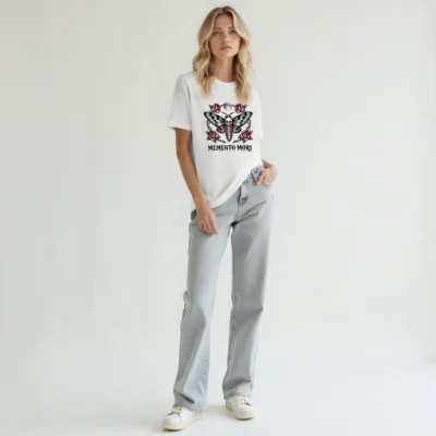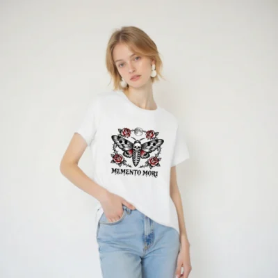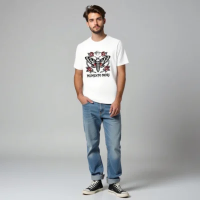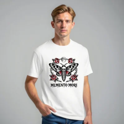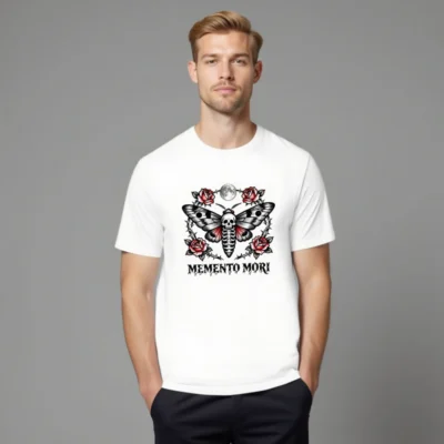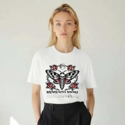 Wear the timeless ‘Memento Mori’ philosophy with this unisex staple t-shirt featuring a striking tattoo-style moth design—skull body, red-winged wings, surrounded by thorny roses and a full moon. Premium cotton blend, classic fit, ideal for gothic, vintage, or alternative fashion lovers. Perfect for everyday wear or as a meaningful gift.