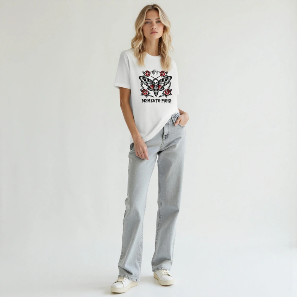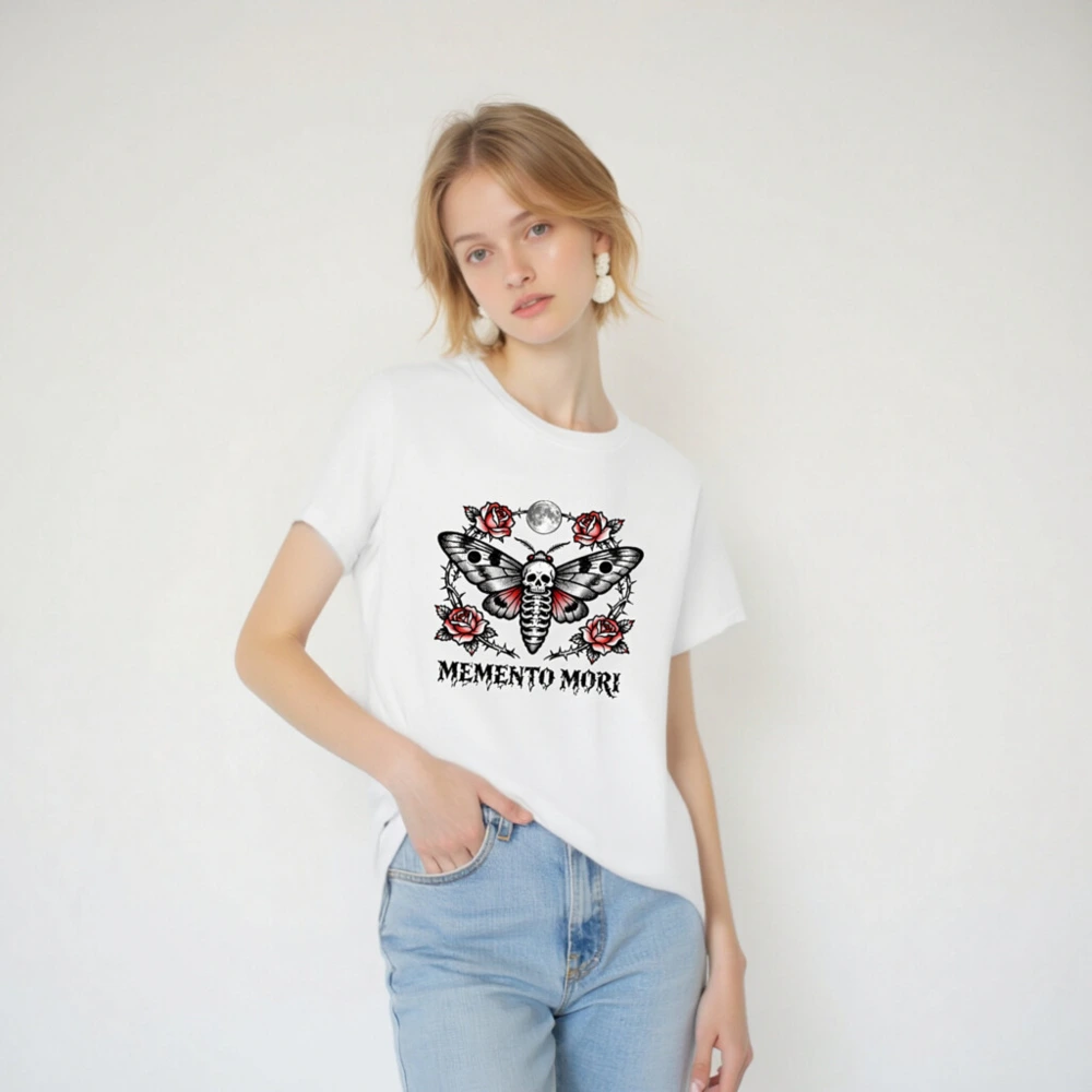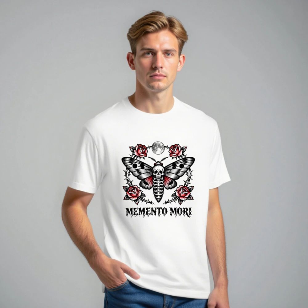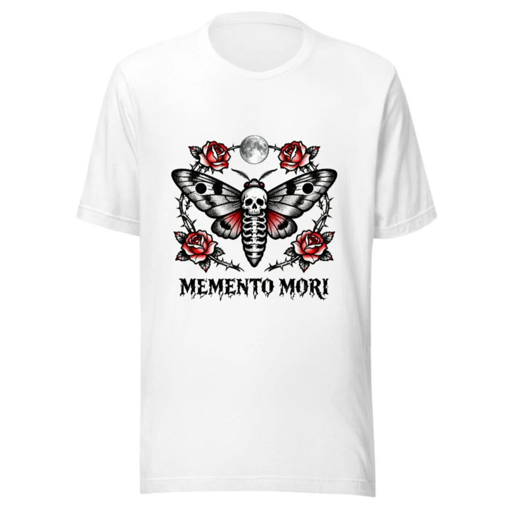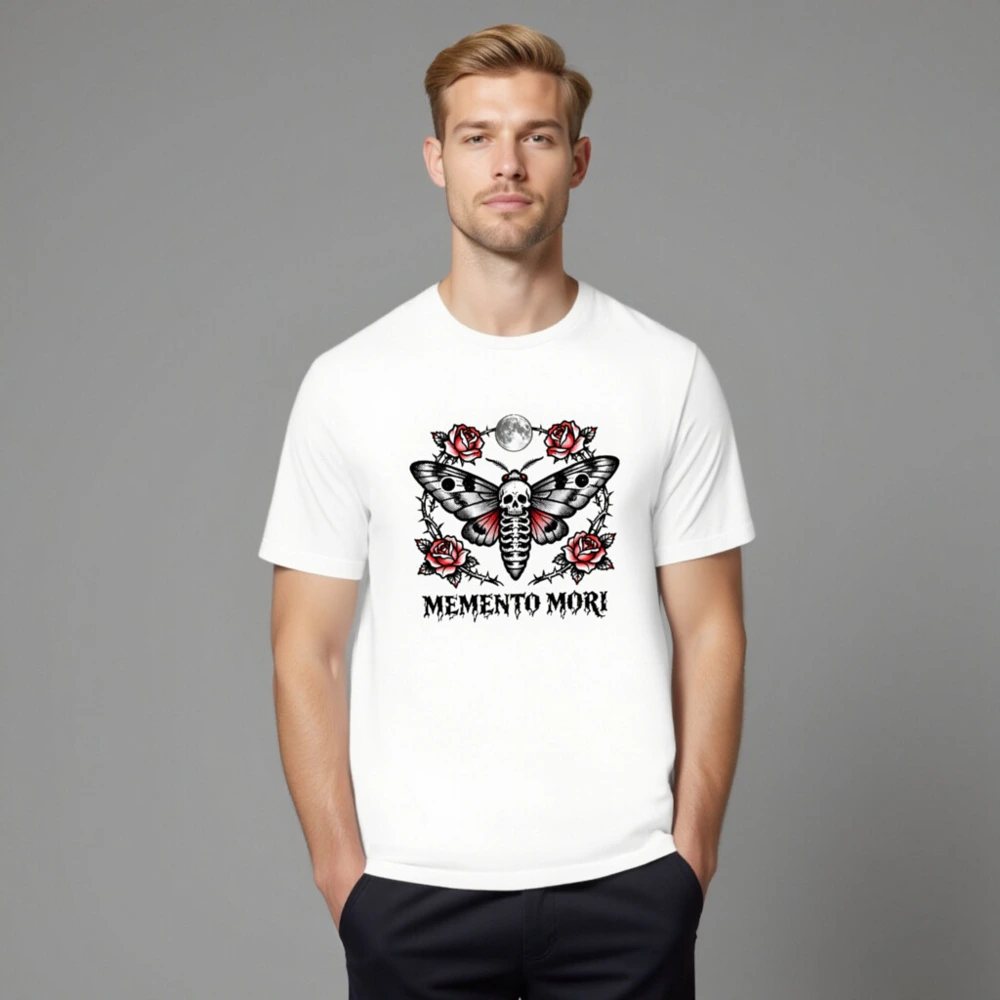 Memento Mori Moth T-Shirt – Unisex Staple Tee with Skull & Roses Tattoo Design
