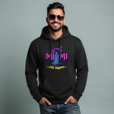 Showcase the iconic Miami vibe with this premium unisex pullover hoodie featuring vibrant neon ‘MIAMI’ lettering, a retro art deco tower, palm trees, and ‘305 Nights’ script. Designed for comfort and style—soft cotton blend, classic fit, front pouch pocket. Perfect for fans of Miami culture, nightlife, or tropical aesthetics. Ideal for casual wear, travel, or as a souvenir. Available in all sizes for men, women, and gender-neutral wearers.