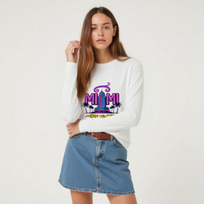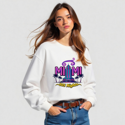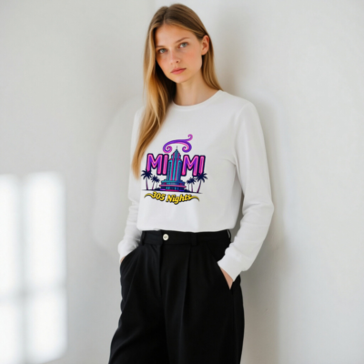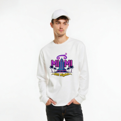 Showcase Miami pride with this unisex long sleeve tee featuring the vibrant ‘MIAMI 305 Nights’ graphic—neon purple and teal art with iconic palm trees and a retro skyscraper. Perfect for fans of Miami culture, nightlife, or Florida vibes. Soft cotton blend, classic fit, gender-neutral style. Ideal for casual wear, travel souvenirs, or as a statement piece. Authentic Miami-themed apparel.