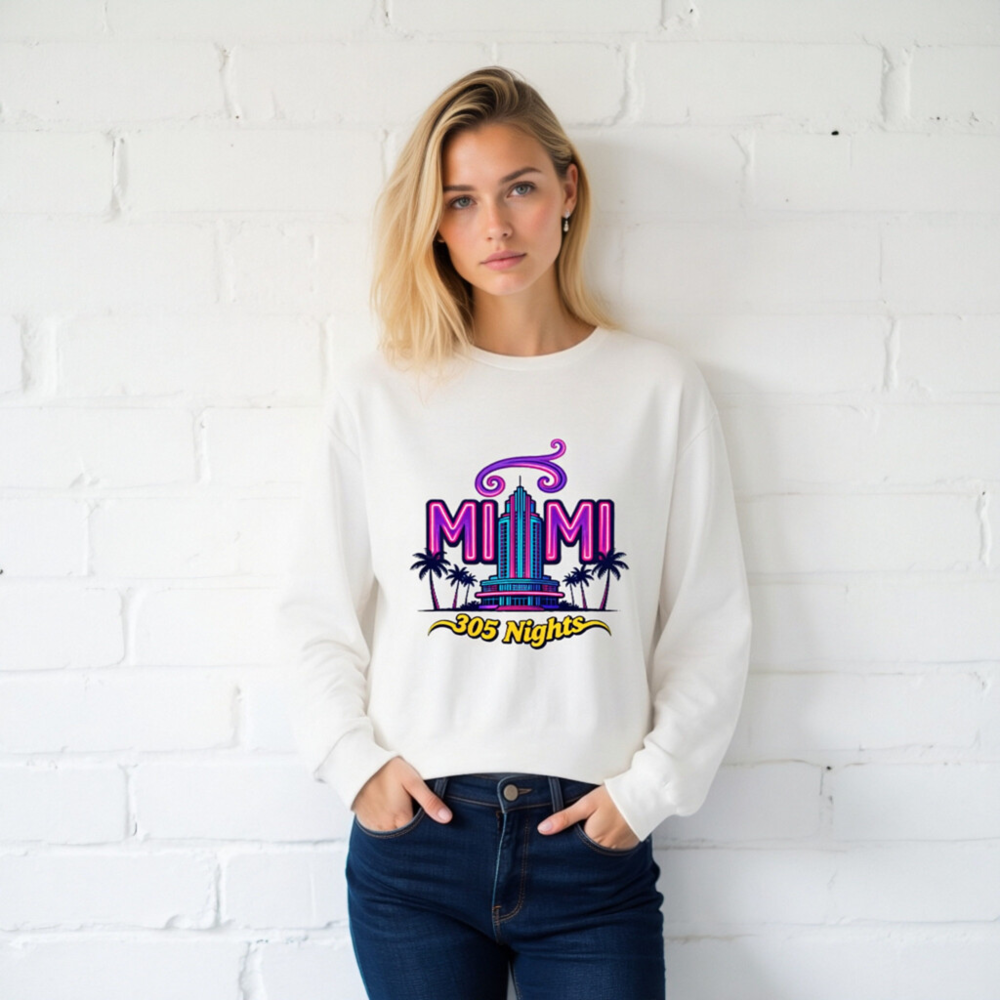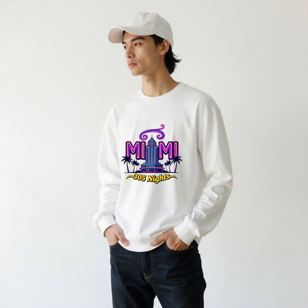 Showcase Miami pride with this unisex long sleeve tee featuring the vibrant ‘MIAMI 305 Nights’ graphic—neon purple and teal art with iconic palm trees and a retro skyscraper. Perfect for fans of Miami culture, nightlife, or Florida vibes. Soft cotton blend, classic fit, gender-neutral style. Ideal for casual wear, travel souvenirs, or as a statement piece. Authentic Miami-themed apparel.