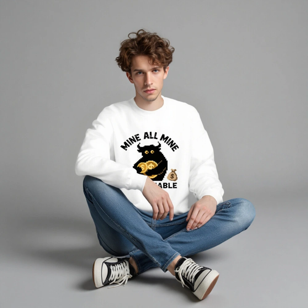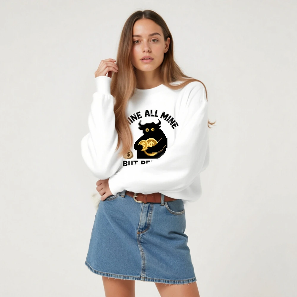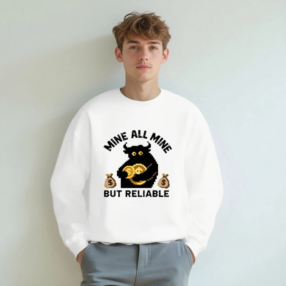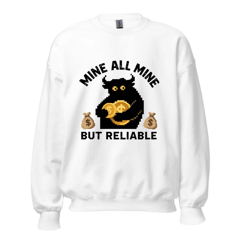 Pixel-art black bull holding gold coins, flanked by money bags—’Mine All Mine But Reliable’ slogan. Premium unisex crew neck sweatshirt, soft cotton blend, comfortable fit for everyday wear. Ideal for crypto fans and meme lovers seeking bold, humorous streetwear. Designed for durability and style.