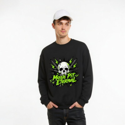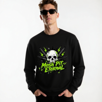 Black unisex crew neck sweatshirt featuring a bold neon green skull, crossed guitars, lightning bolts, and ‘Mosh Pit Eternal’ graphic. Designed for rock/metal fans—comfortable, durable, and perfect for concerts or everyday wear. Premium fabric, classic fit, machine washable. Ideal gift for music lovers who live the mosh pit spirit.