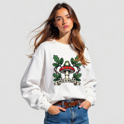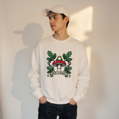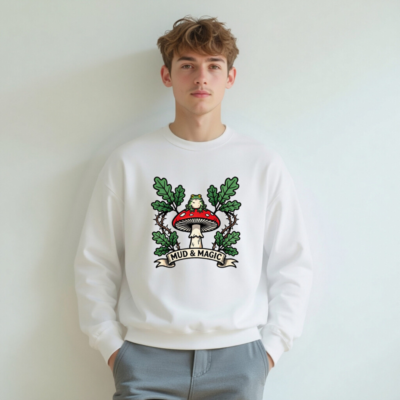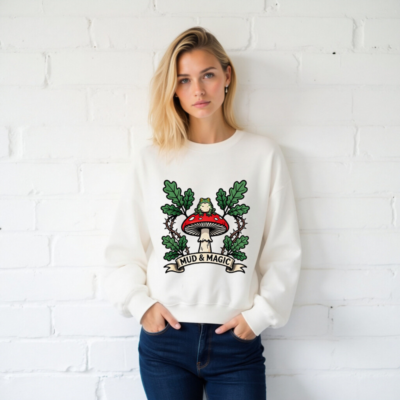 A unisex crew neck sweatshirt featuring a whimsical design: a green frog perched atop a red-and-white mushroom, surrounded by oak leaves and thorny vines. The ‘MUD & MAGIC’ banner adds vintage charm. Soft, comfortable fit for everyday wear. Ideal for nature lovers, fantasy fans, and those who appreciate magical forest aesthetics.