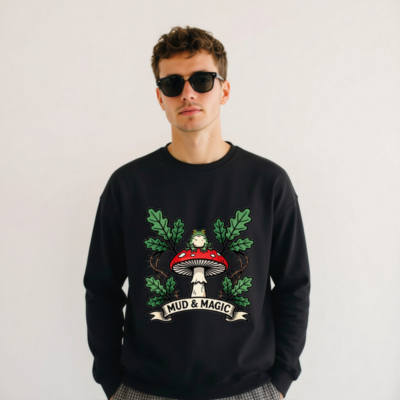 A cozy black unisex crew neck sweatshirt featuring a charming illustration of a green frog perched atop a red-and-white mushroom, surrounded by oak leaves and vines. The design is centered around the ‘MUD & MAGIC’ banner, evoking woodland whimsy. Made for comfort with soft fabric, this versatile piece suits casual wear or nature lovers. Ideal for everyday style with a touch of magic.