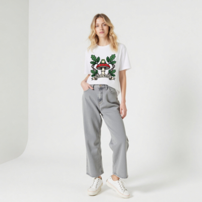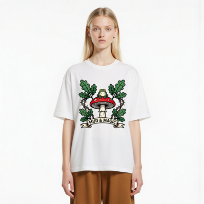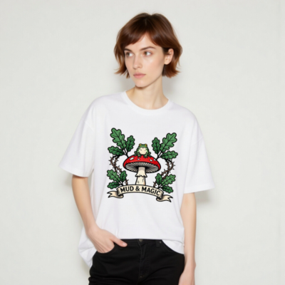 Wear the enchanting ‘Mud & Magic’ design: a green frog perches atop a red-and-white mushroom, framed by oak leaves and thorny vines. This unisex staple t-shirt features a whimsical forest motif—perfect for nature lovers and fantasy fans. Soft, comfortable cotton blend. Size inclusive. Official Mud & Magic collection.