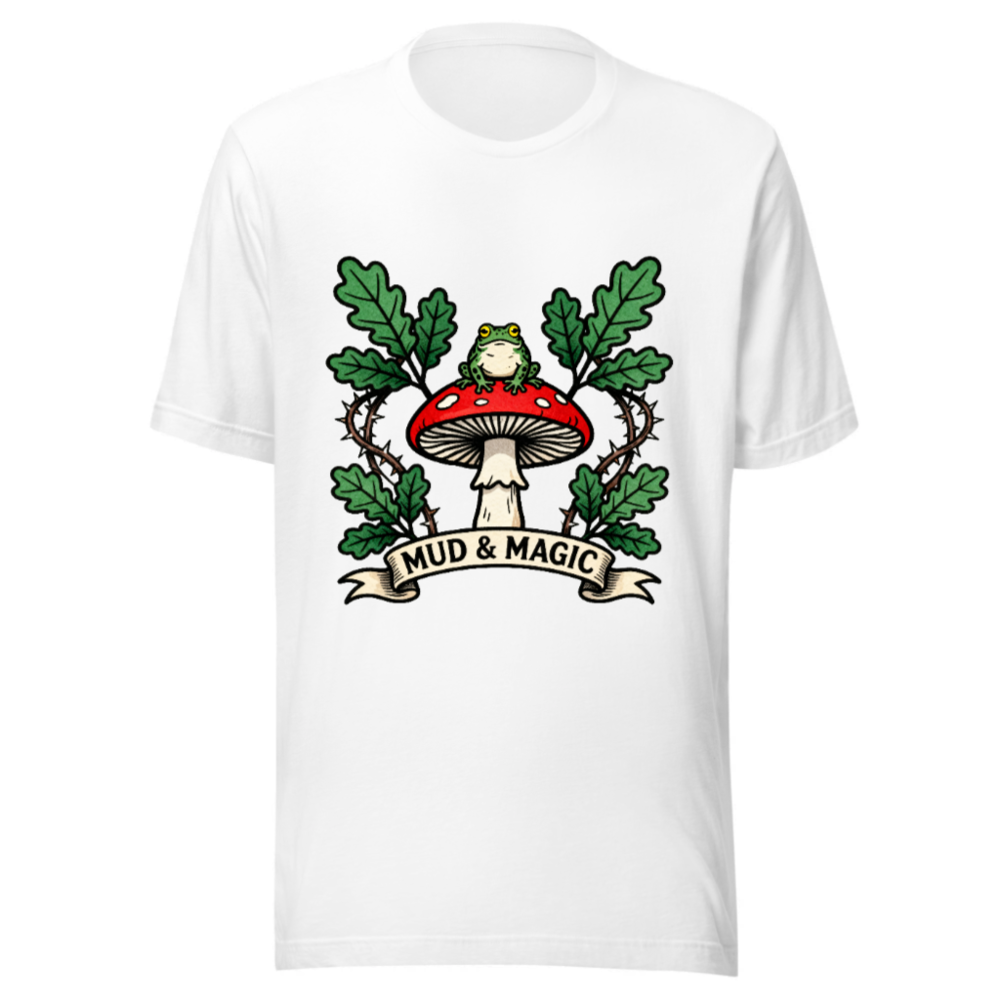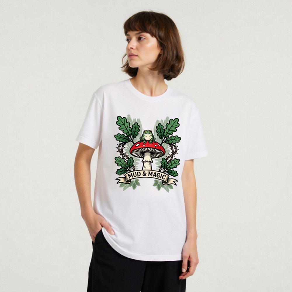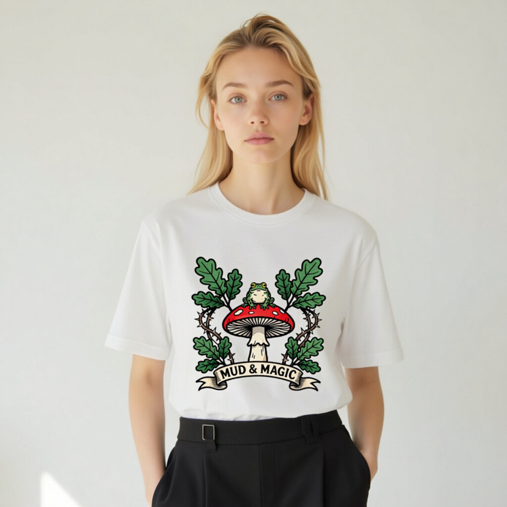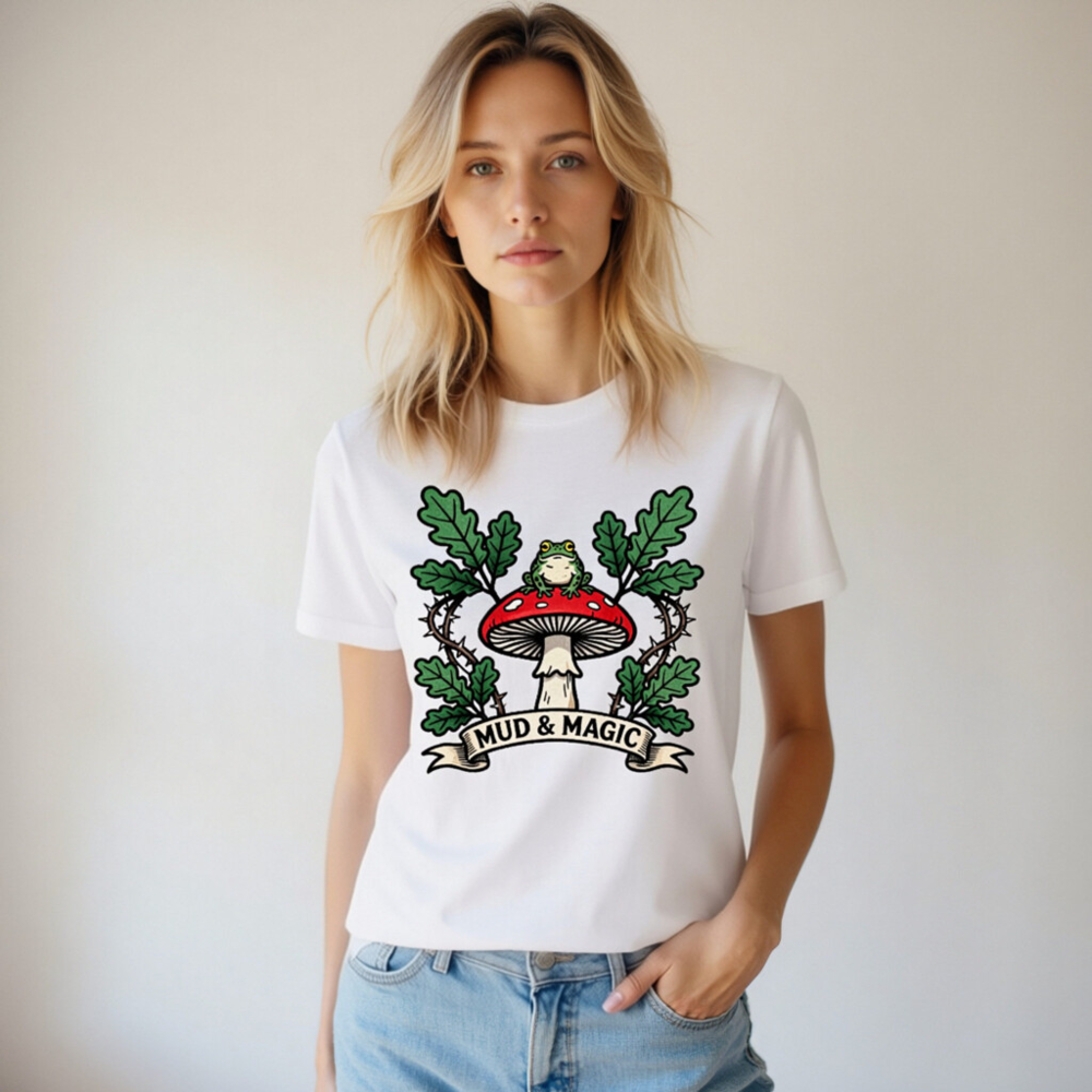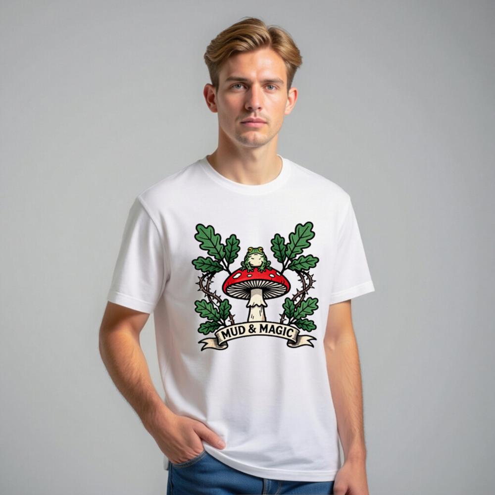 Wear the enchanting ‘Mud & Magic’ design: a green frog perches atop a red-and-white mushroom, framed by oak leaves and thorny vines. This unisex staple t-shirt features a whimsical forest motif—perfect for nature lovers and fantasy fans. Soft, comfortable cotton blend. Size inclusive. Official Mud & Magic collection.