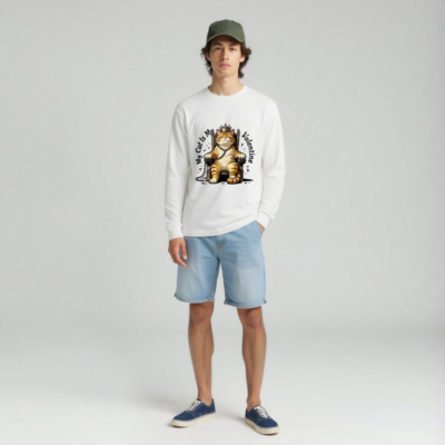 This unisex long sleeve tee features a charming orange tabby cat wearing a golden crown, seated regally on a throne with chains—perfect for cat lovers celebrating Valentine’s Day. The playful design combines affection and humor, making it an ideal gift or self-indulgent statement piece. Soft cotton blend, comfortable fit, and eye-catching print. Ideal for casual wear or themed occasions.