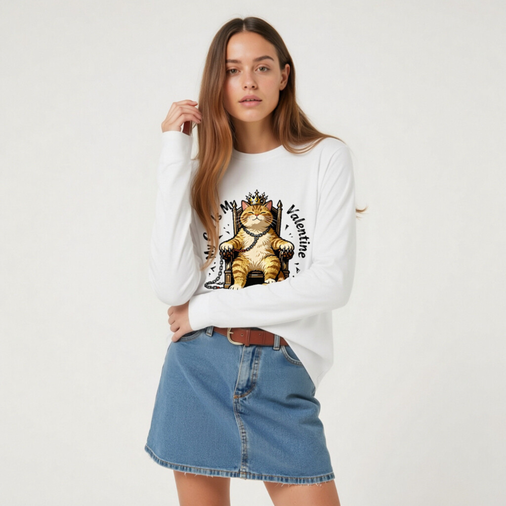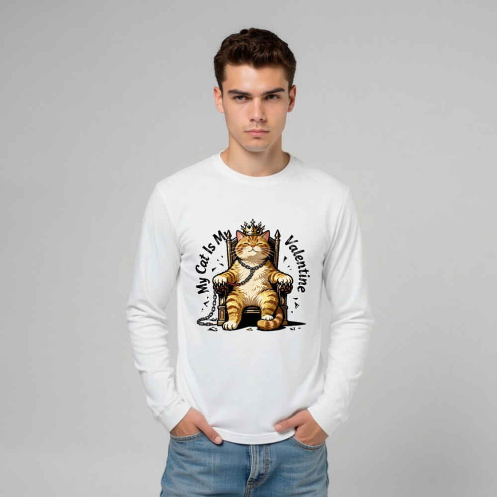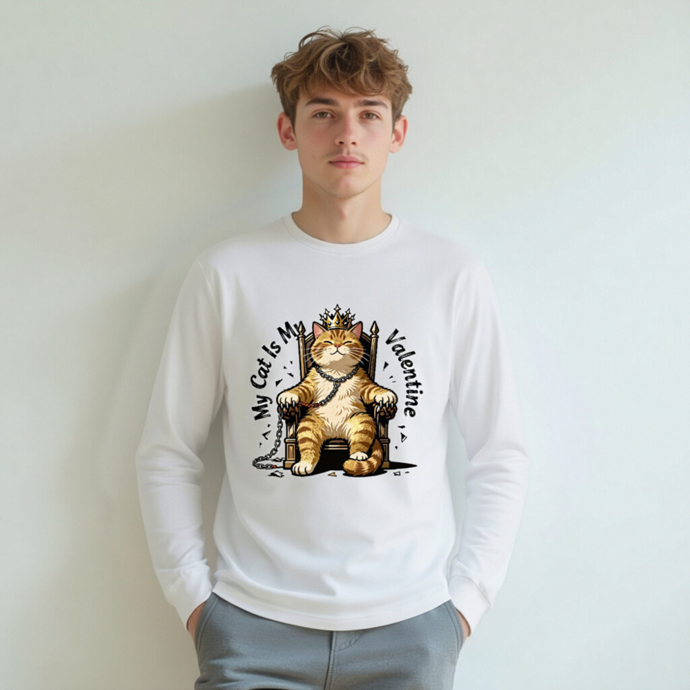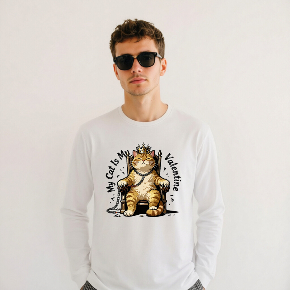 This unisex long sleeve tee features a charming orange tabby cat wearing a golden crown, seated regally on a throne with chains—perfect for cat lovers celebrating Valentine’s Day. The playful design combines affection and humor, making it an ideal gift or self-indulgent statement piece. Soft cotton blend, comfortable fit, and eye-catching print. Ideal for casual wear or themed occasions.
