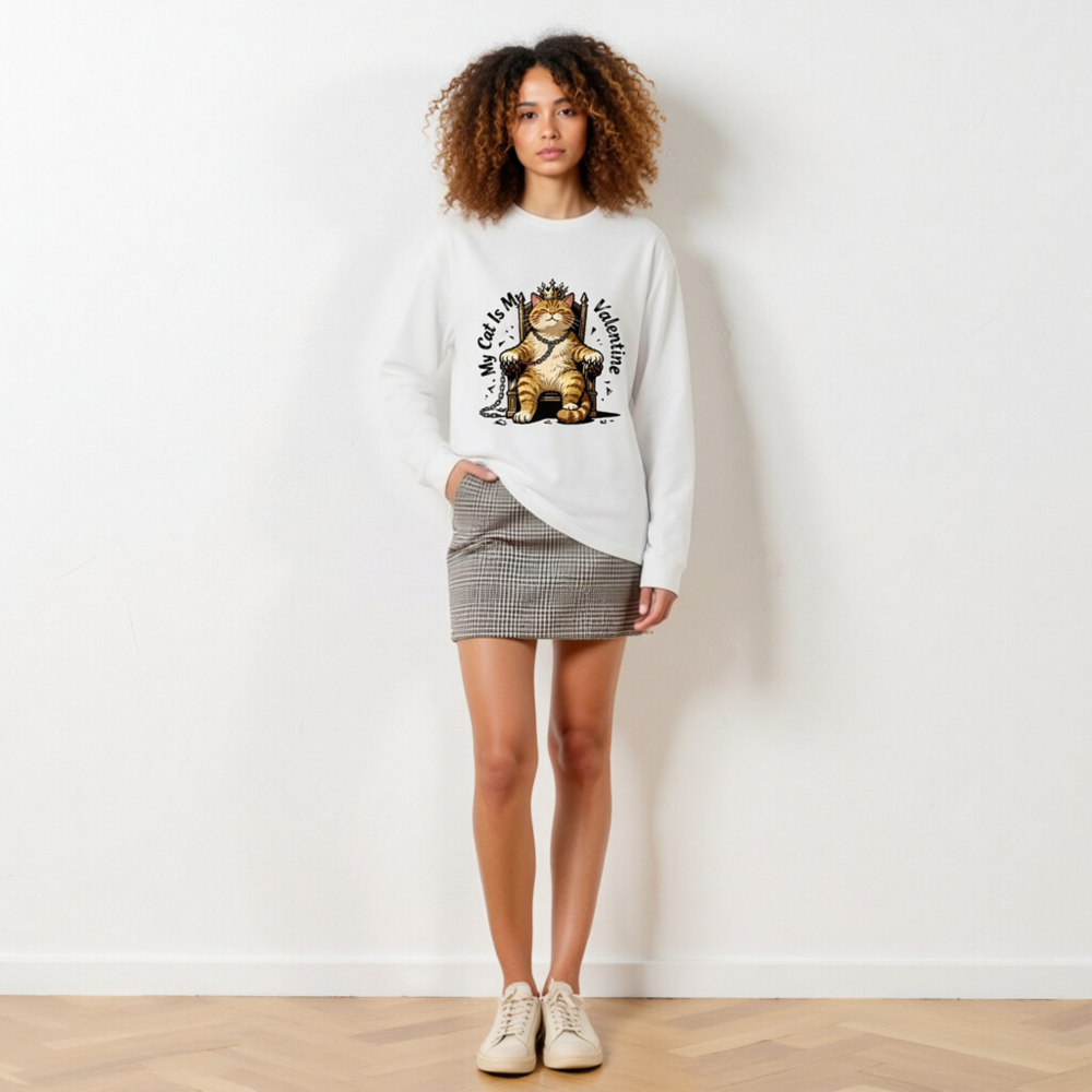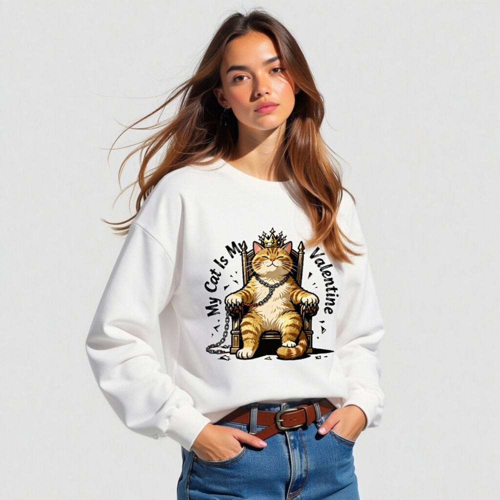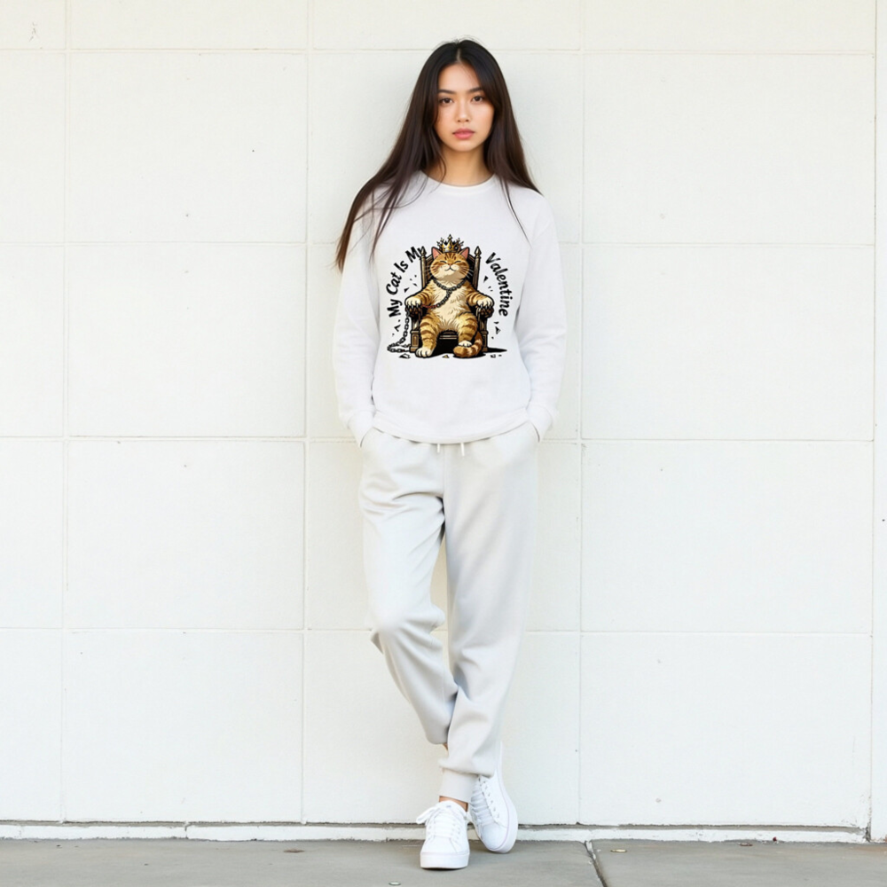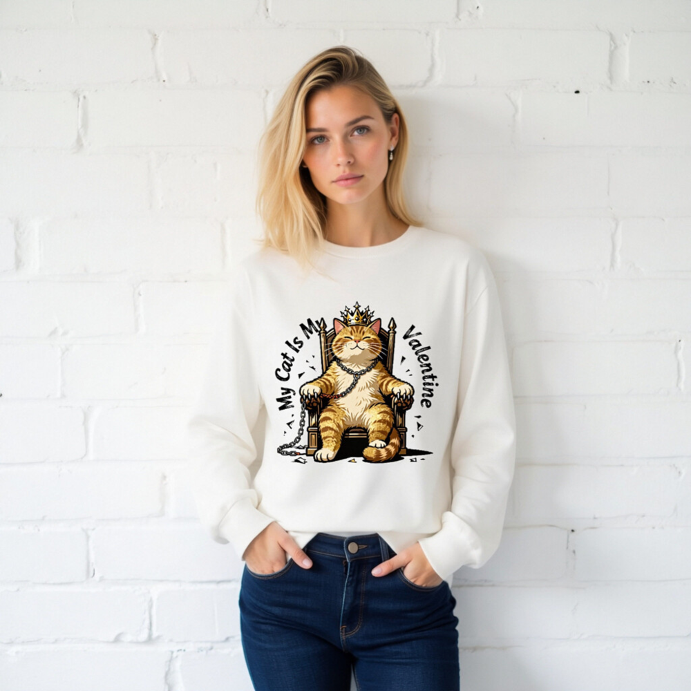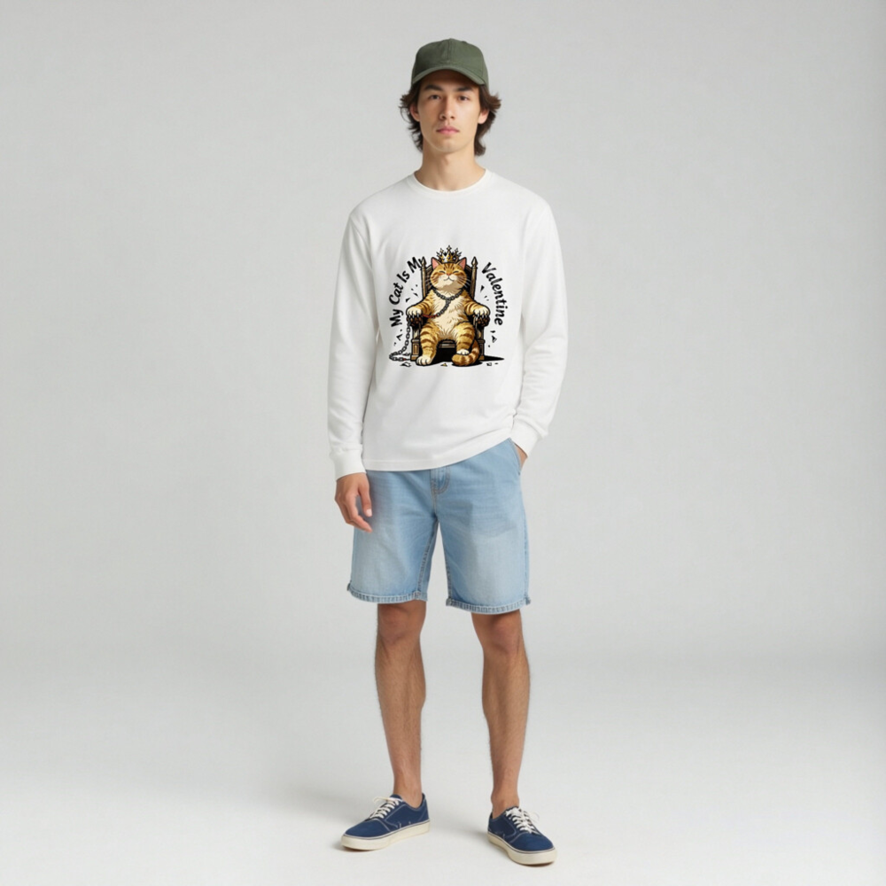 This unisex long sleeve tee features a charming orange tabby cat wearing a golden crown, seated regally on a throne with chains—perfect for cat lovers celebrating Valentine’s Day. The playful design combines affection and humor, making it an ideal gift or self-indulgent statement piece. Soft cotton blend, comfortable fit, and eye-catching print. Ideal for casual wear or themed occasions.