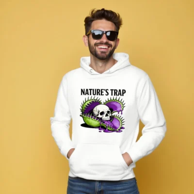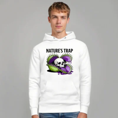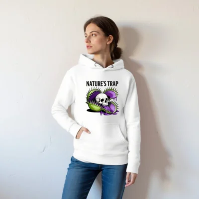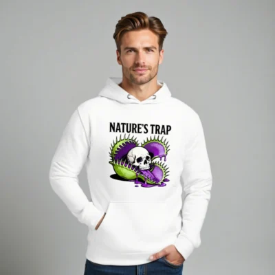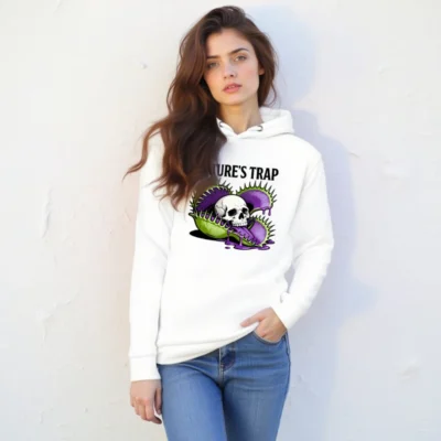Wear the bold ‘Nature’s Trap’ design: a striking unisex premium pullover hoodie featuring a vivid skull entangled in purple-and-green Venus flytrap jaws. Crafted for comfort and style, this high-quality hoodie combines edgy botanical horror art with everyday wearability. Perfect for nature lovers, goth fans, and plant enthusiasts seeking unique apparel. Machine-washable, durable fabric, true to size.